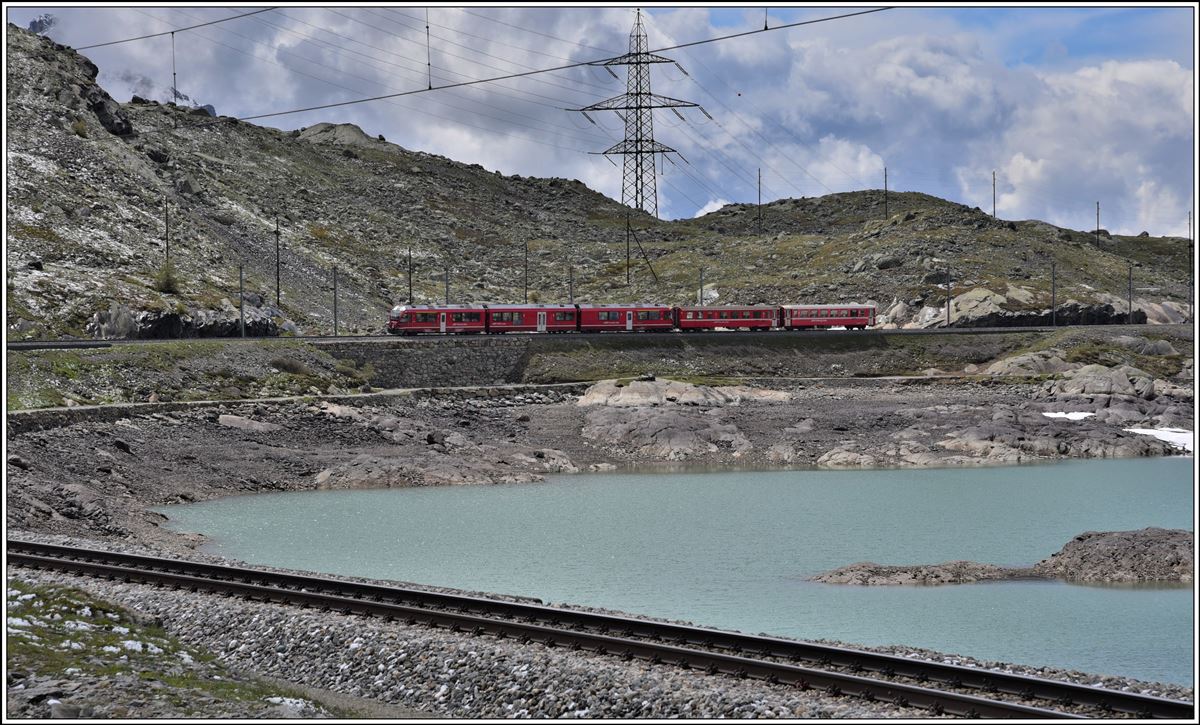 R4629 nach Campocologno mit ABe 4/4 III 54 "Hakone" und 51 "Poschiavo" oberhalb der Galeria lunga zwischen Ospizio Bernina und Alp Grüm. Temporäre Bergseelein während der Schneeschmelze bieten neue Ansichten. (09.06.2020) Herbert Graf