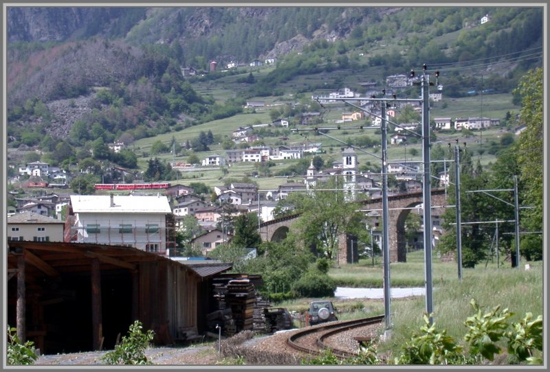 Vom Berninapass her nähert sich ein Regionalzug mit Güterlast der Station Brusio, die sich oberhalb des Kreisviadukts bei der Kirche befindet. (08.05.2007) Herbert Graf
