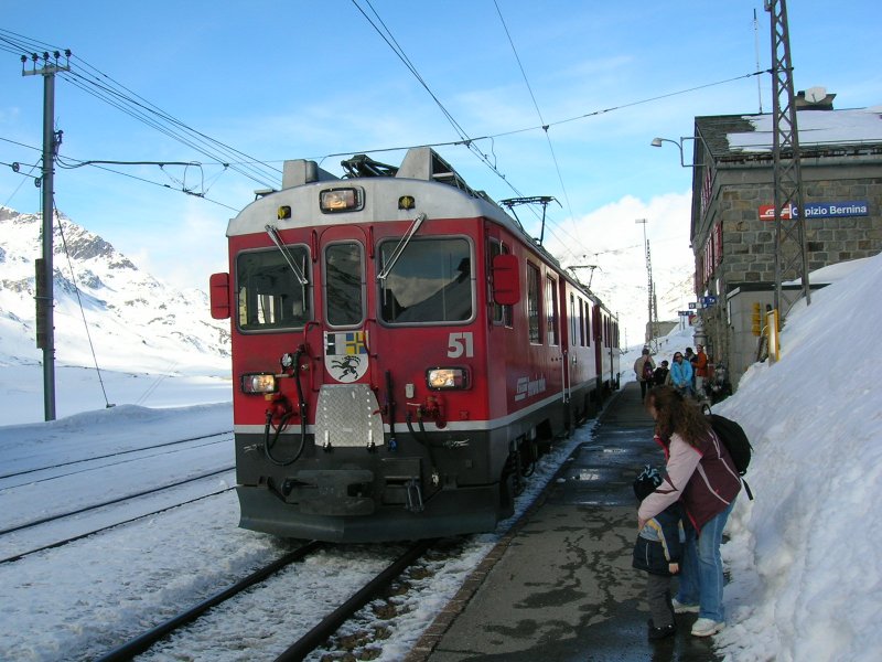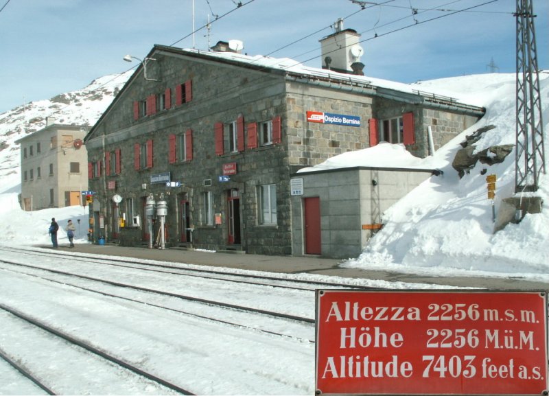 Ospizio-Bernina (Bernina-Hospiz)höchstgelegener Bahnhof der Rhätischen Bahn.Etwas südlich vom Bahnhof befindet sich auch eine überdachte Drehscheibe für die Schneeschleuder.17.02.07 Peter Walter