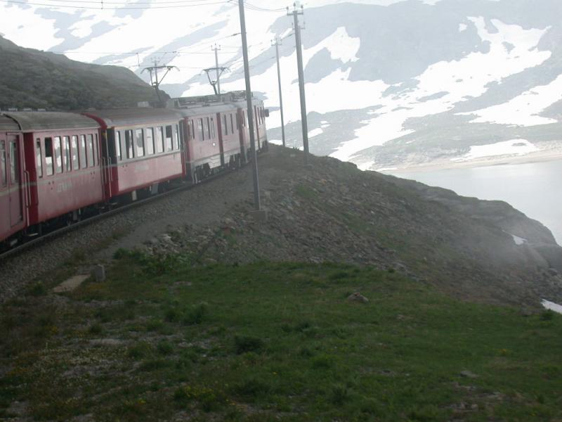 Ein langer Regionalzug erklimmt die 70 Promille Steigung zwischen Bernina Lagalp und der Passhöhe. An diesem 18.09.2001 liegt bereits der erste Schnee. Herbert Graf