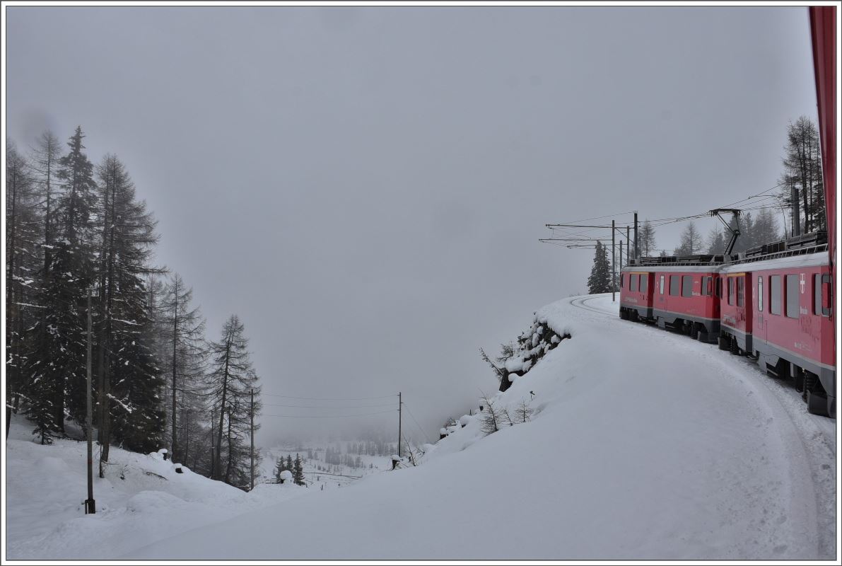 ABe 8/12 3508 ''Richard Coray'' am 18.4.2017 bei leichtem Schneefall in Bernina Diavolezza. Dem Wetter entsprechend ''schwach besetzt'' waren die beiden offenen Aussichtswagen am Schluss des Regios nach Tirano Silvio Jenny