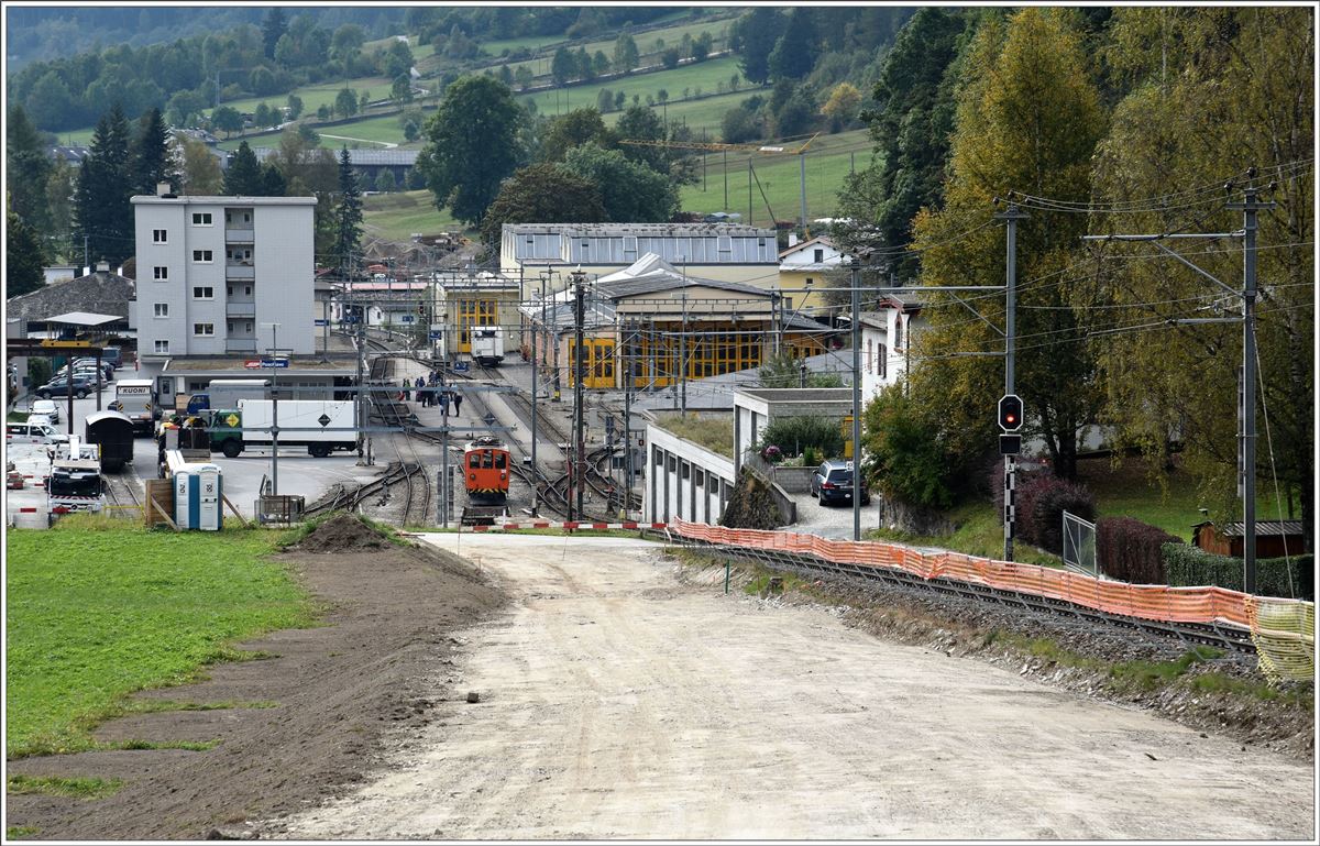 Die Vorbereitungen für die Doppelspur und Kreuzungsgleise Richtung Privilasco sind in vollem Gang. Blick auf den Bahnhof Poschiavo, der in Zukunft nur noch über einen Hausperron verfügen wird. (09.10.2016) Herbert Graf