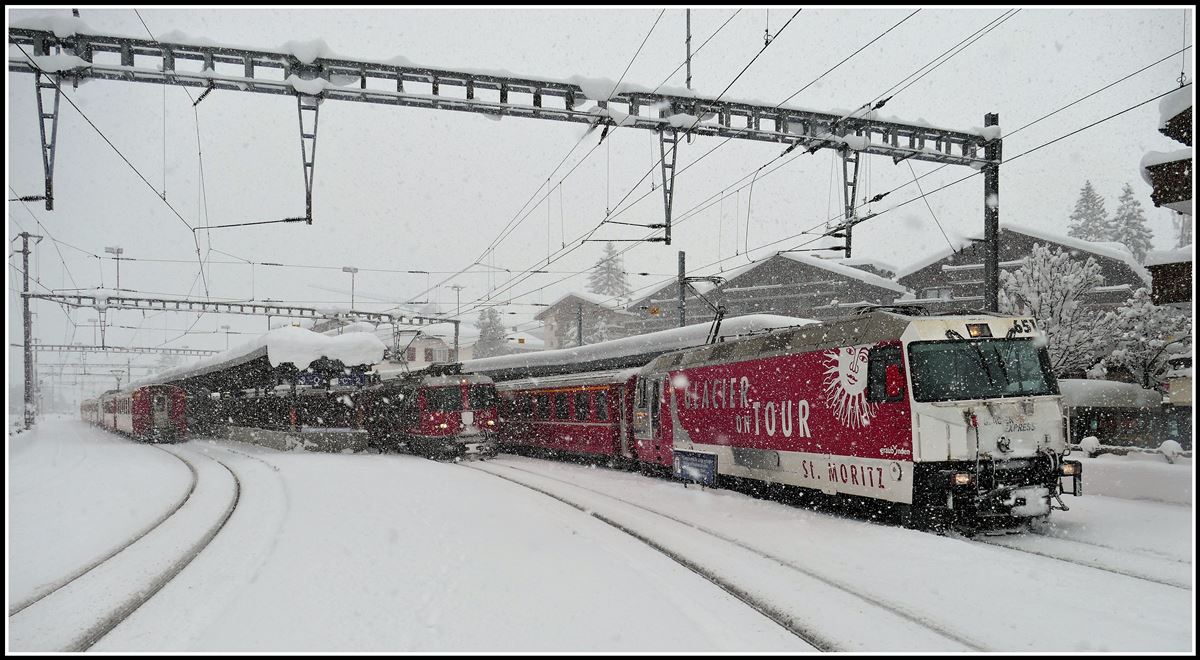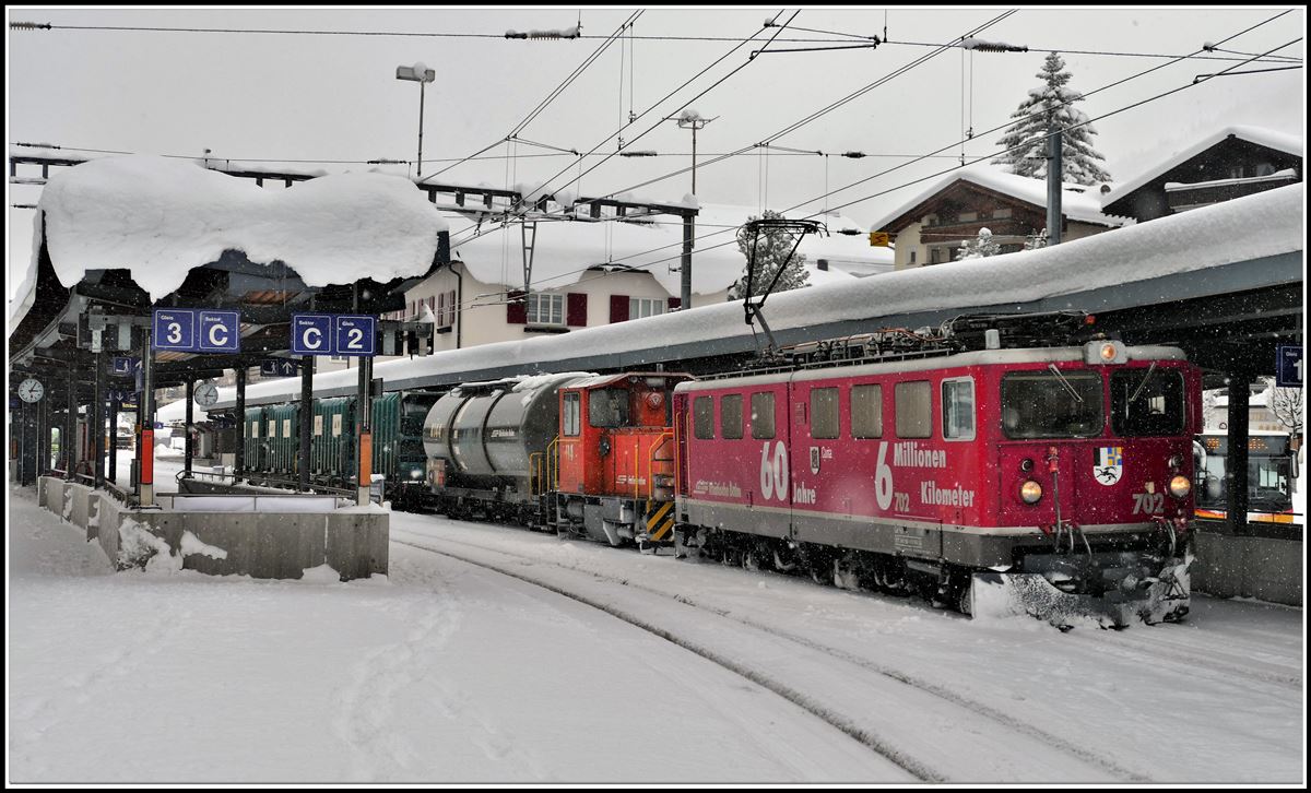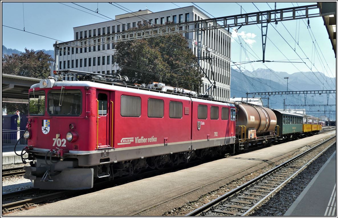 RhB Ge 4/4 617 "LGB" trifft am 20.09.2018 morgens um 6.38 Uhr mit Zug 4011 in Davos-Platz ein. Mit im Zug: der neue Steuerwagen Bt und ein Spar-Container mit ratterndem Kühlaggregat. Kurt Wolfert