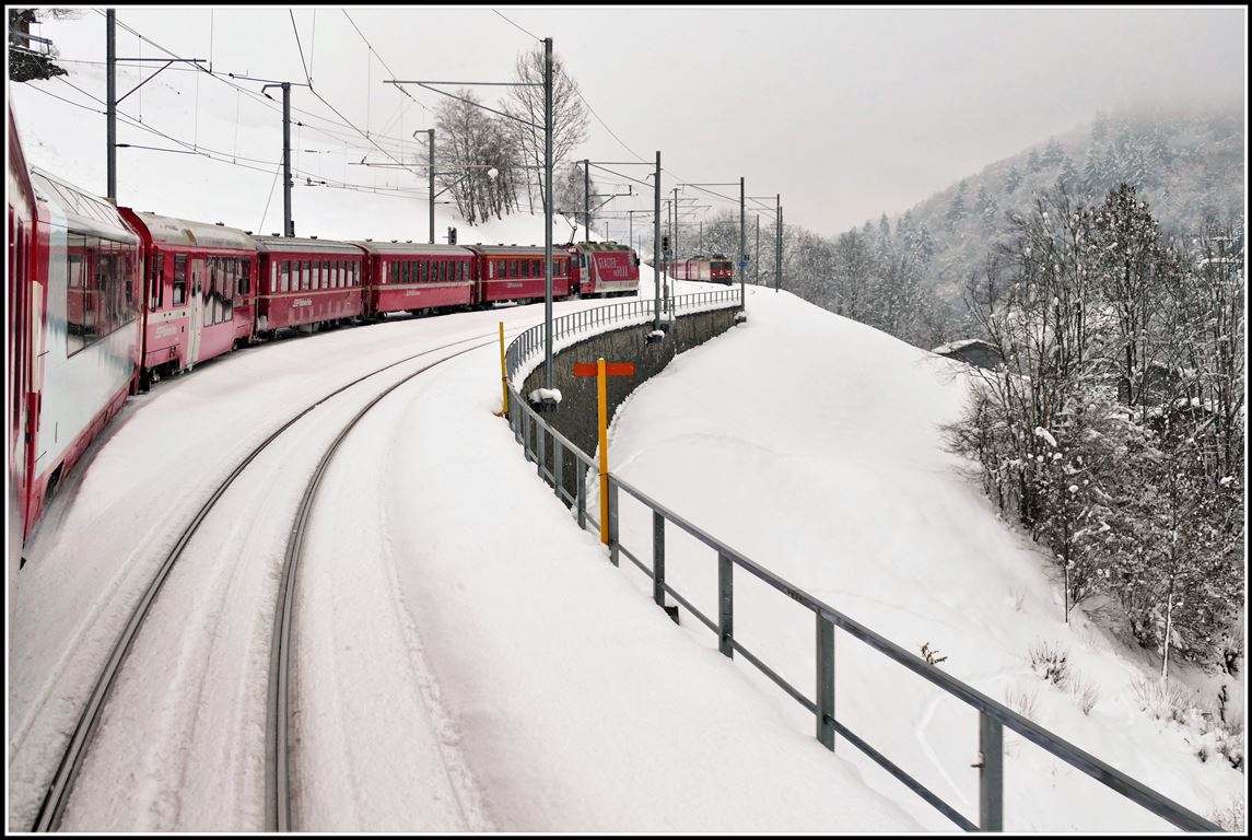 RE1240 nach Landquart mit der Ge 4/4 II 629 "Tiefencastel" bei Malans, wo die neue Doppelspur einen Schwenker nach links macht für einen geringeren Kurvenradius. (23.10.2019) Herbert Graf