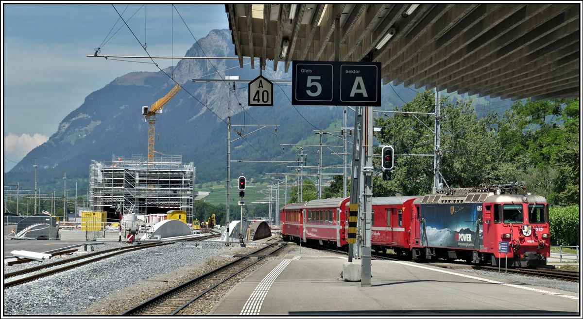 RE1340 aus Samedan mit Ge 4/4 II 615 "Klosters" trifft in Landquart ein. Links ist die neue Brücke über die Landquart mit der Doppelspur Richtung Malans und zur Zufahrt zum Interventionszentrum RhB zu sehen. (10.07.2019) Herbert Graf