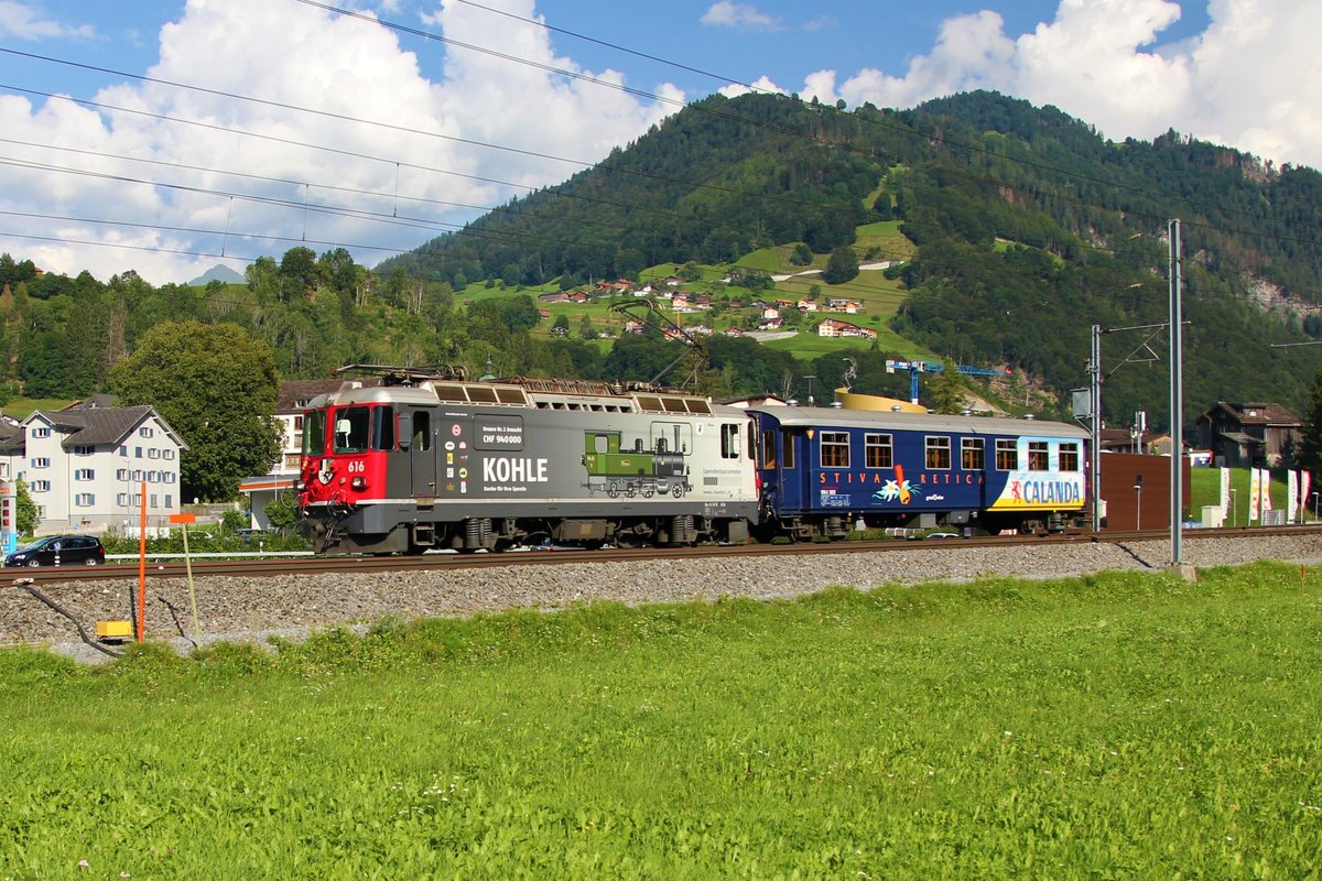 RhB Ge 4/4 II 616 "Spendenlok Projekt RHÆTIA" war am 25.08.2019 in Schiers zum Dorffest. Hier um 17:07 Uhr als Zug 9060 zurück nach Landquart. Mit dabei der Wagen Stiva Retica. Kurt Wolfert