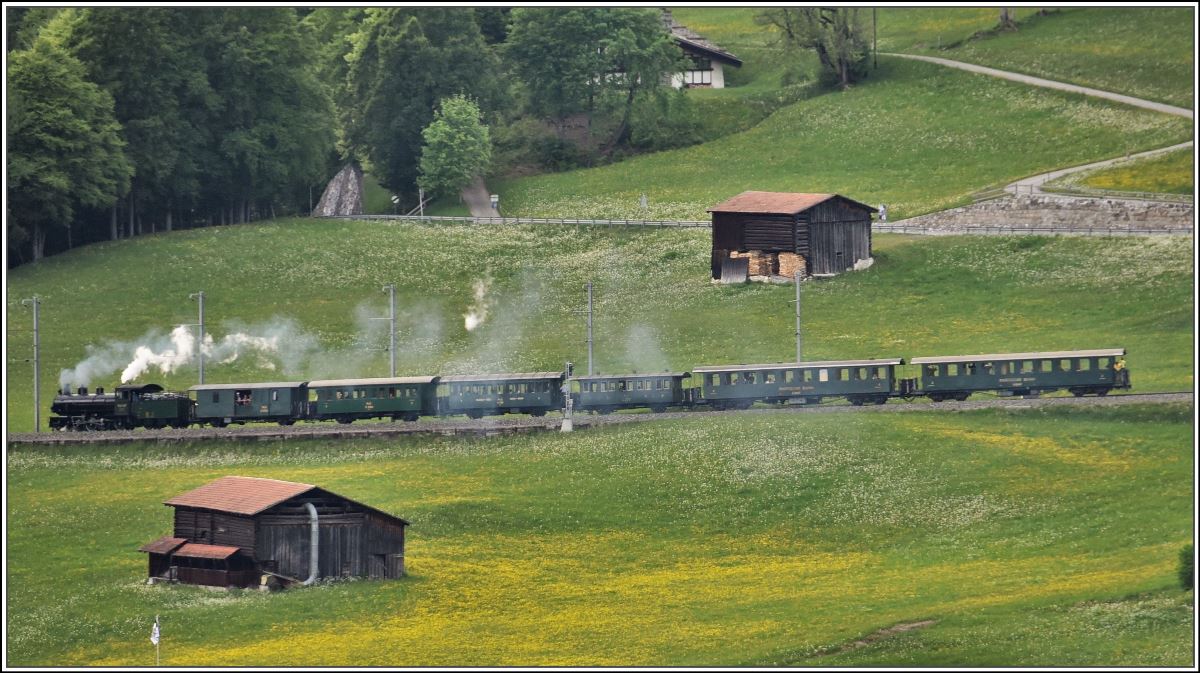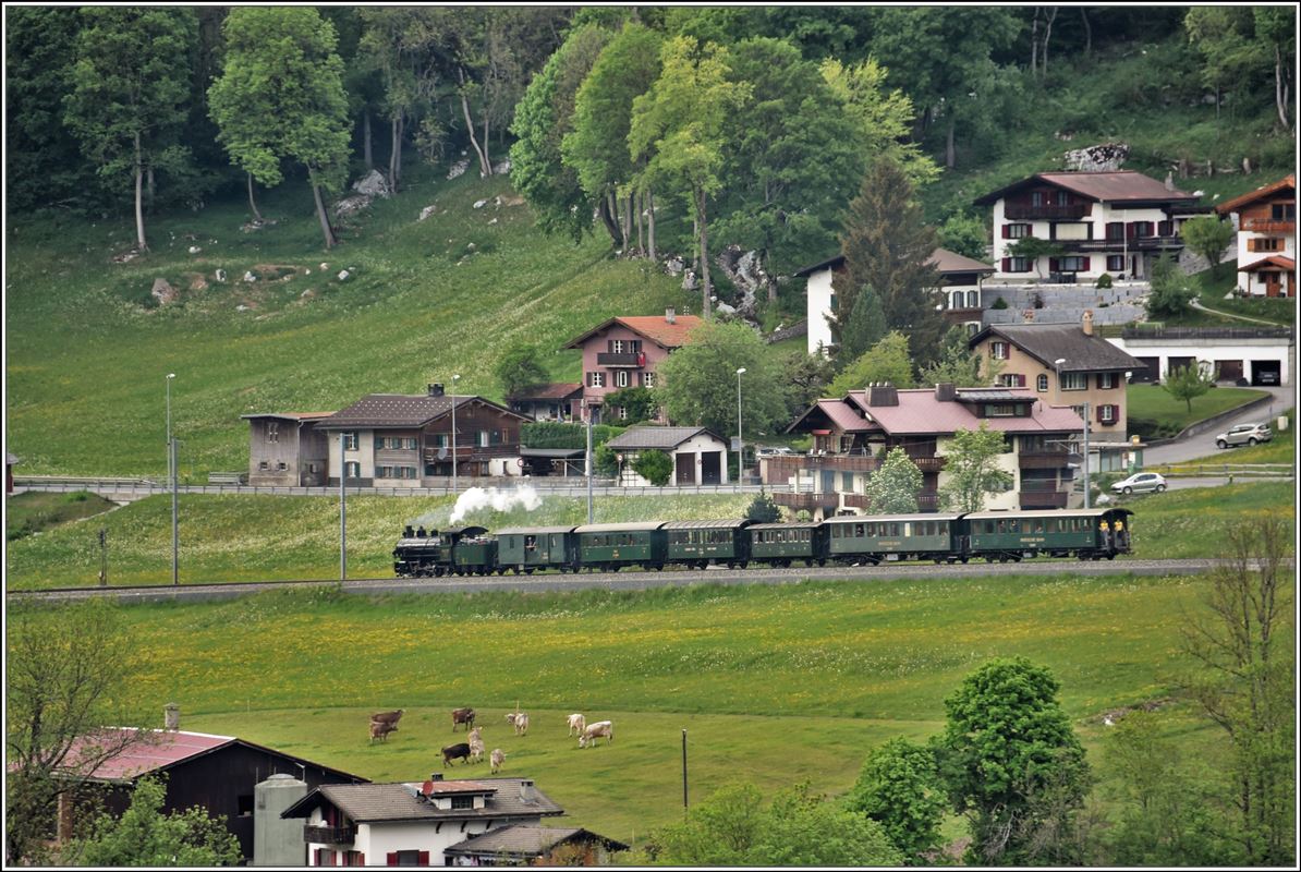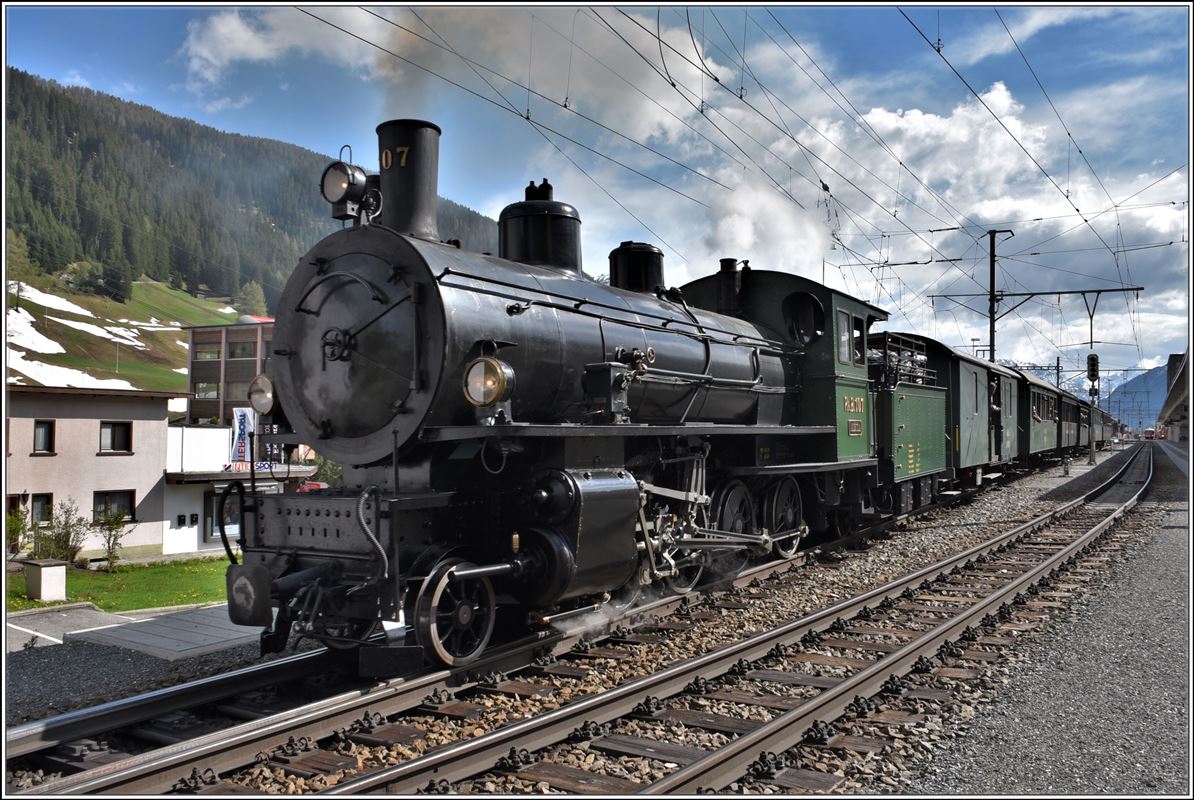 Dampfextrazug 2056 nach Landquart mit G 4/5 107  Albula  verlässt Klosters Platz. (13.05.2018)