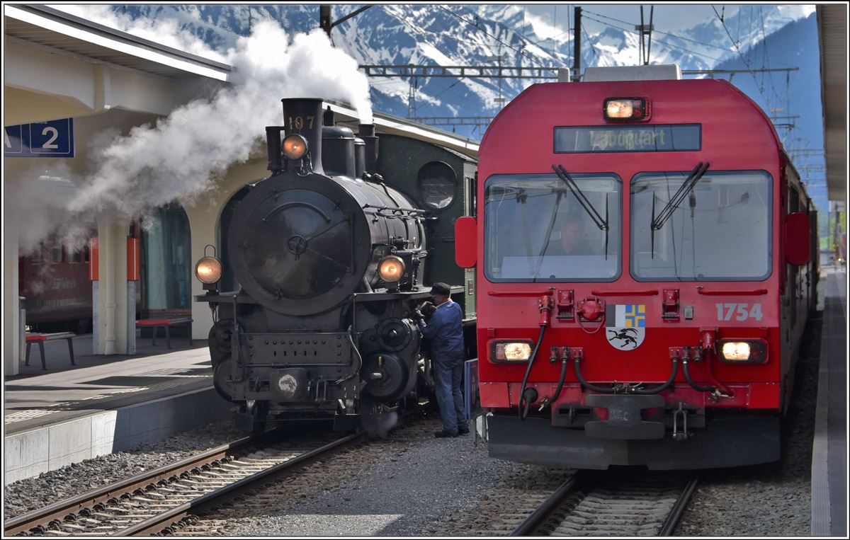Dampfextrazug 2056 nach Landquart mit G 4/5 107  Albula  und RE1056 nach Landquart mit Steuerwagen 1754 in Davos Platz. (13.05.2018)