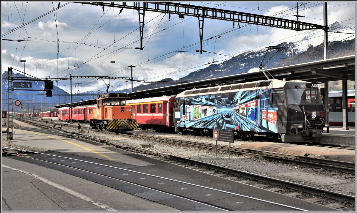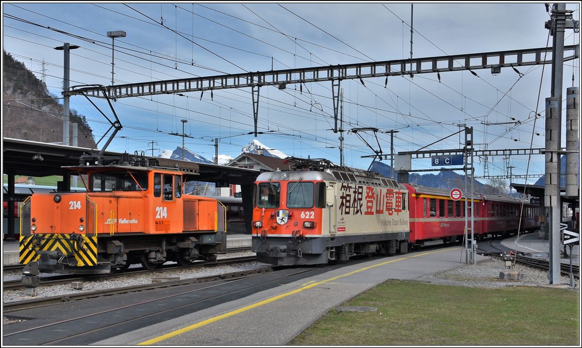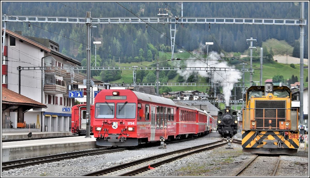 RE1056 mit Steuerwagen 1754, Dampfzug 2056 mit G 4/5 107  Albula  und Gmf 4/4 243 in Klosters Platz. (13.05.2018)