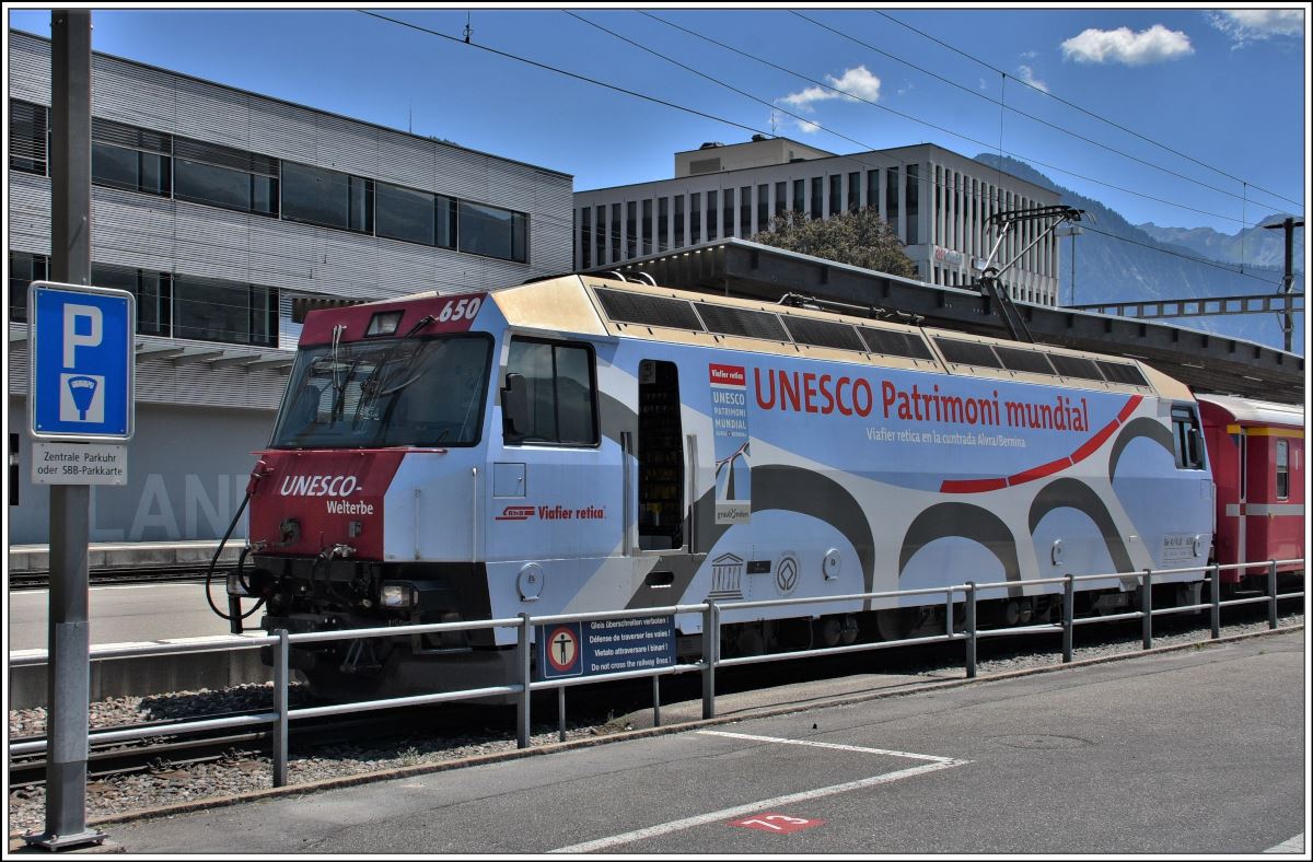 RE1045 mit Ge 4/4 III 650 "Seewis-Valzeina" in Landquart. Parkgebühr bezahlt? (14.07.2018)