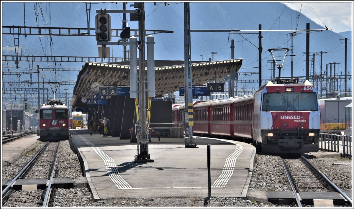 RE1245 mit Ge 474 II 616 "Filisur" nach Scuol-Tarasp und Ge 4/4 III 650 "Seewis-Valzeina" mit RE1045 nach Davos Platz in Landquart. (14.07.2018)