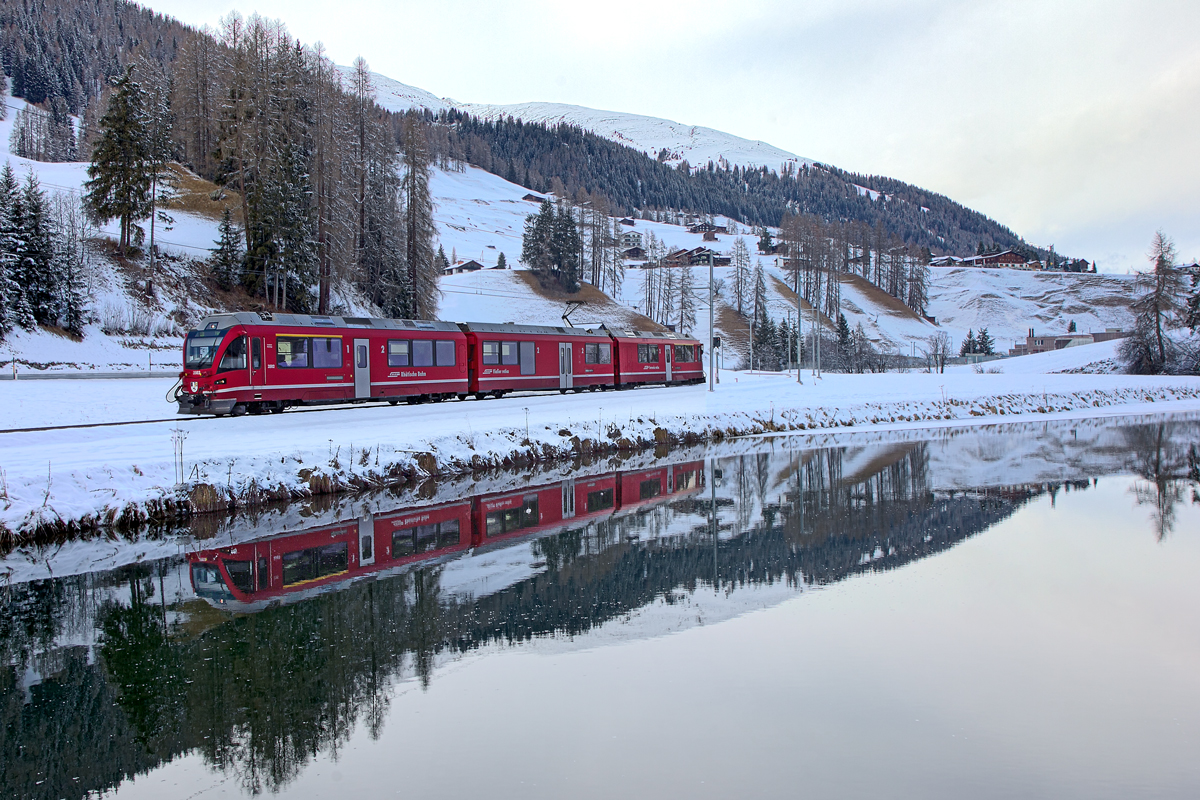 Ein Be 4/4 Vorortspendel ist als RE1034 zwischen Davos Platz und Klosters Platz unterwegs im frisch verschneiten Wald bei Cavadürli. (04.02.2016) Herbert Graf