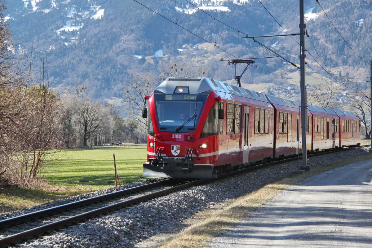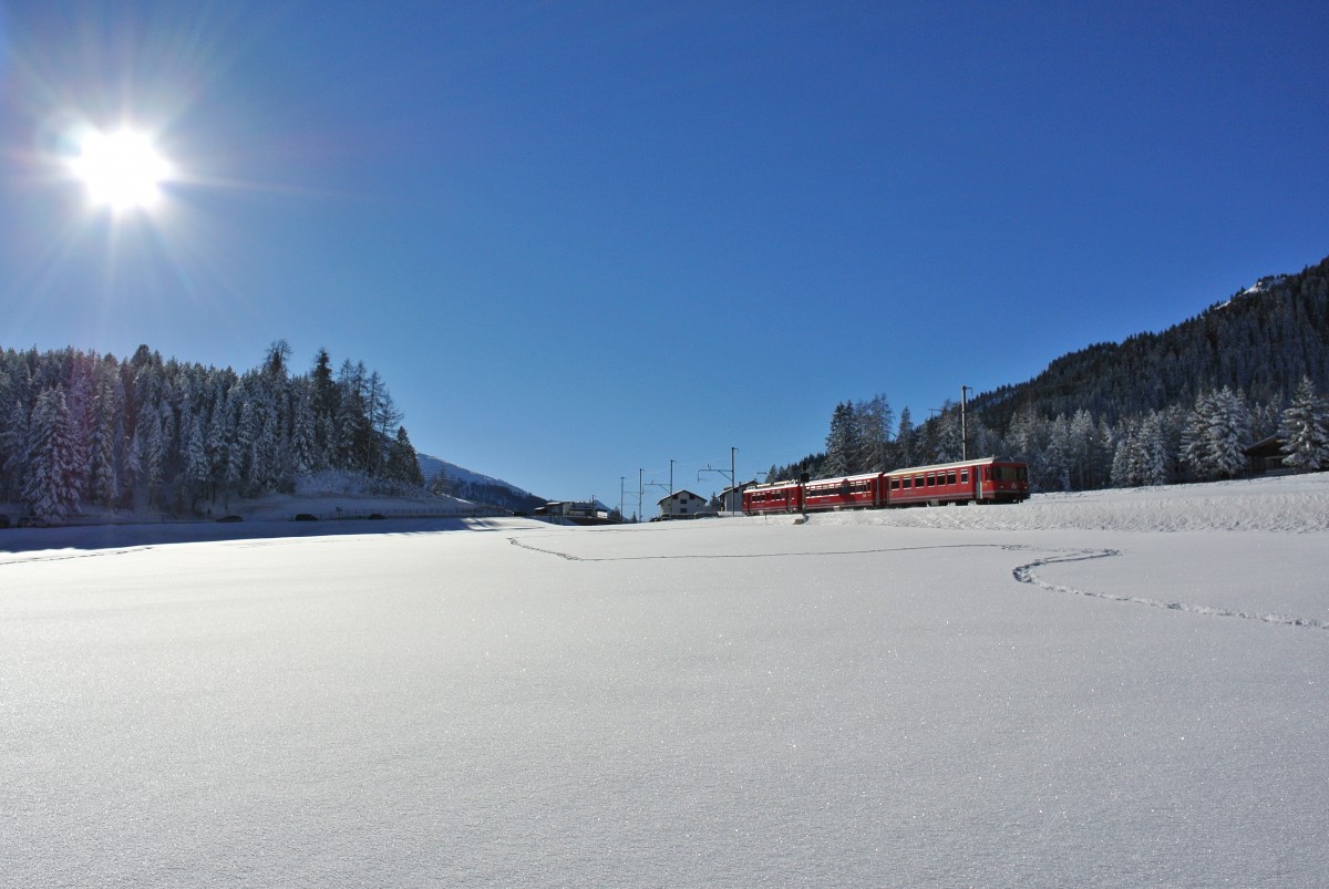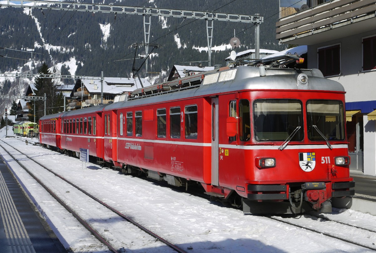 Die Komposition Be 4/4 511, B 2411 und ABDt 1711 wurde im Churer Vorortverkehr von den Allegra 4/16 abgelöst. Aktuelle Verwendung: Sportzug Klosters - Davos (Aufnahme: Klosters, 31.1.14). Hermann-Josef Weirich