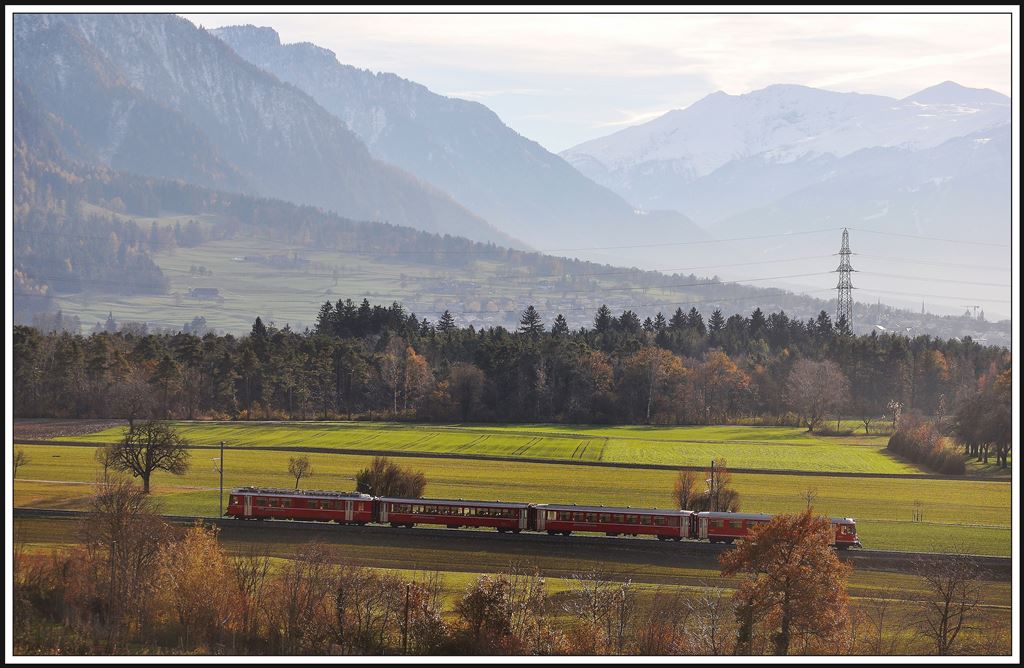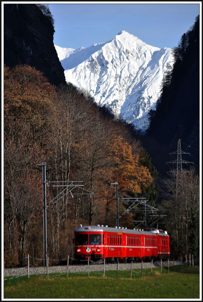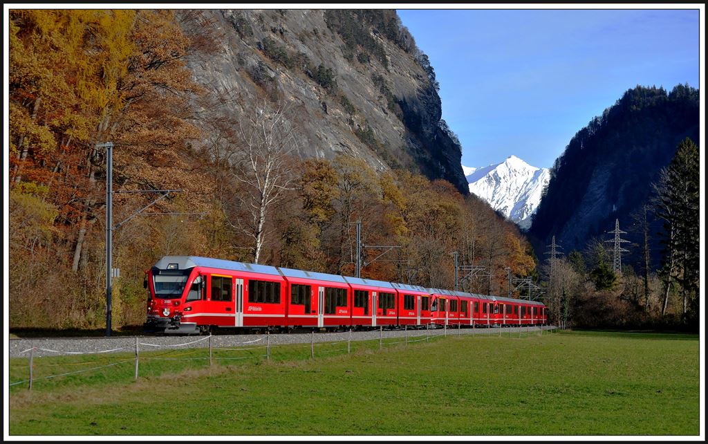 Die S1 1521 von Schiers nach Rhäzüns hat soeben den Chlustunnel verlassen und erreicht in Kürze Malans. Die Pyramide im Hintergrund ist das Chüenihorn 2413m. (29.11.2013) Herbert Graf