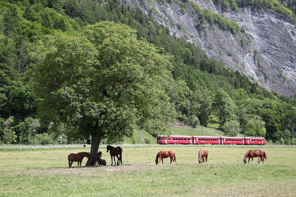 Nur nach genauem Hinsehen ein Bahnbild. Dank der roten Farbe ist der RE1253 nach Scuol zwischen Malans und der Klus (Eingang zum Prättigau) zu erkennen. (17.05.2012) Herbert Graf