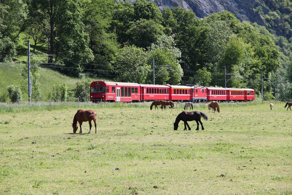 Zwischen Pragg-Jenaz und Schiers befindet sich die Diensstation Fuchsenwinkel, wo gelegentlich Züge kreuzen. RE1245 mit der Ge 4/4 II 612 "Thusis" ist auf dem Weg nach Scuol-Tarasp. (05.07.2012) Herbert Graf