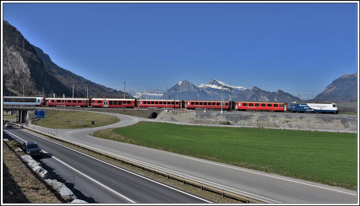 RE1245 nach Scuol-Tarasp mit Ge 4/4 II 619 "Samedan" hat soeben Landquart verlassen und befindet sich auf dem zukünftigen Doppelspurabschnitt Richtung Malans. (18.03.2020)