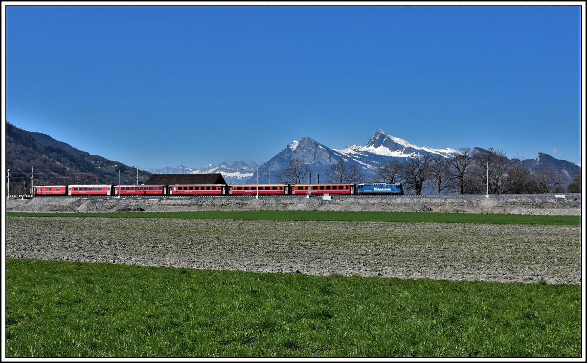RE1045 nach Davos Platz mit der Ge 4/4 III 649 "Lavin" verlässt Landquart. Im Hintergrund Gonzen 1830m, Gauschla 2310m und Regitzer Spitz 1135m. (18.03.2020)