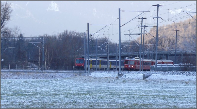 Kurz bevor die Sonne den Talgrund erreicht, treffen bei Trimmis ein Be 4/4 Pendel der RhB und ein RBDe 560 NPZ der SBB aufeinander. (23.01.2008)