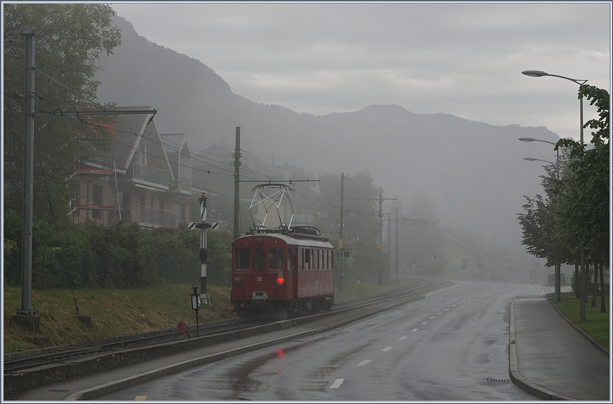 Ein kleiner Zug auf grosser Fahrt: Der RhB Bernina Bahn ABe 4/4 I N° 35 der Blonay Chamby Bahn ist mit dem Bernina Bahn As2 und dem MOB B4 N° 61 (beide auch Blonay-Chamby) als "Valrose Nostalgie Express" kurz vor Les Avants auf der Fahrt von Montreux nach Rougemont.