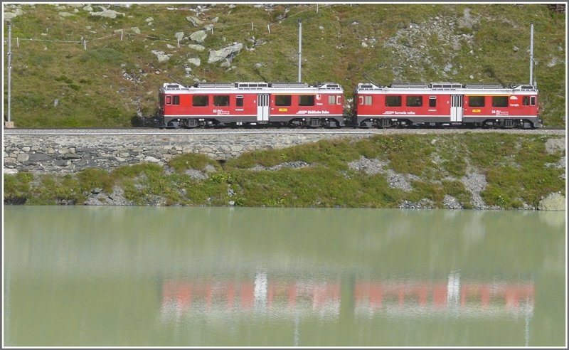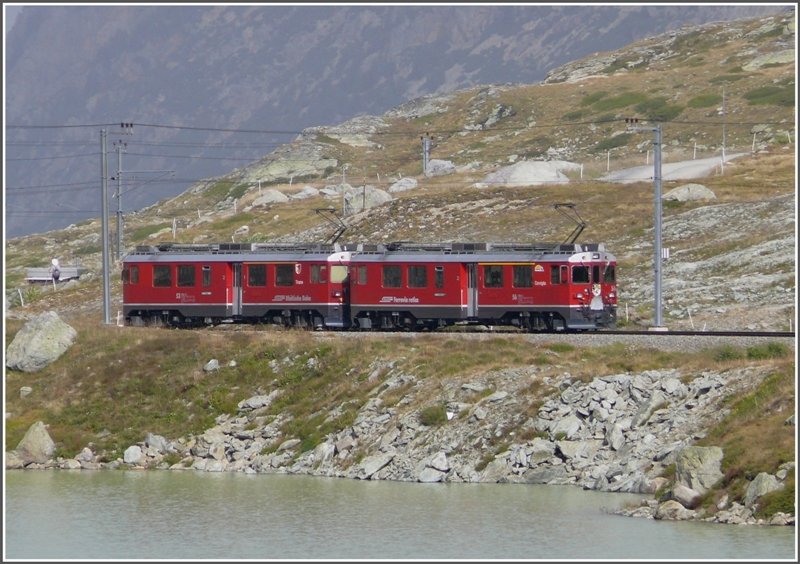 ABe 4/4 III 56 "Corviglia" und ABe 4/4 III 53 "Tirano" verlassen den Baustellenbereich auf dem Berninapass Richtung Pontresina. (10.09.2008) Herbert Graf