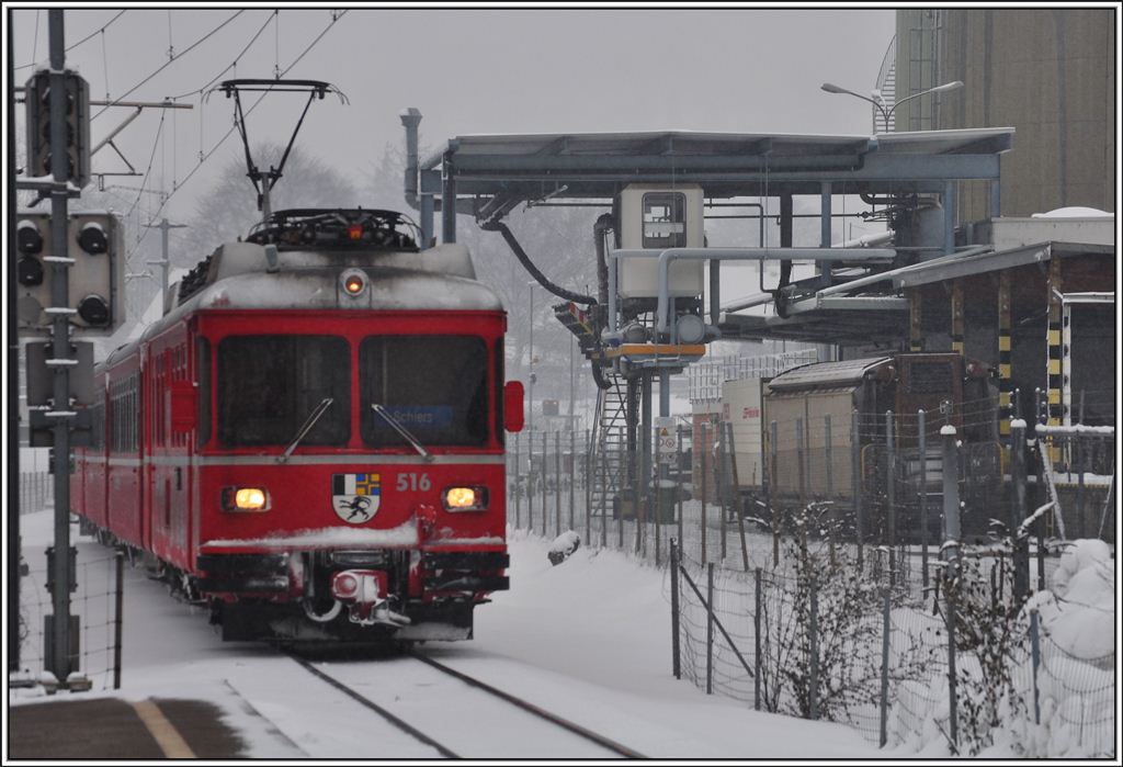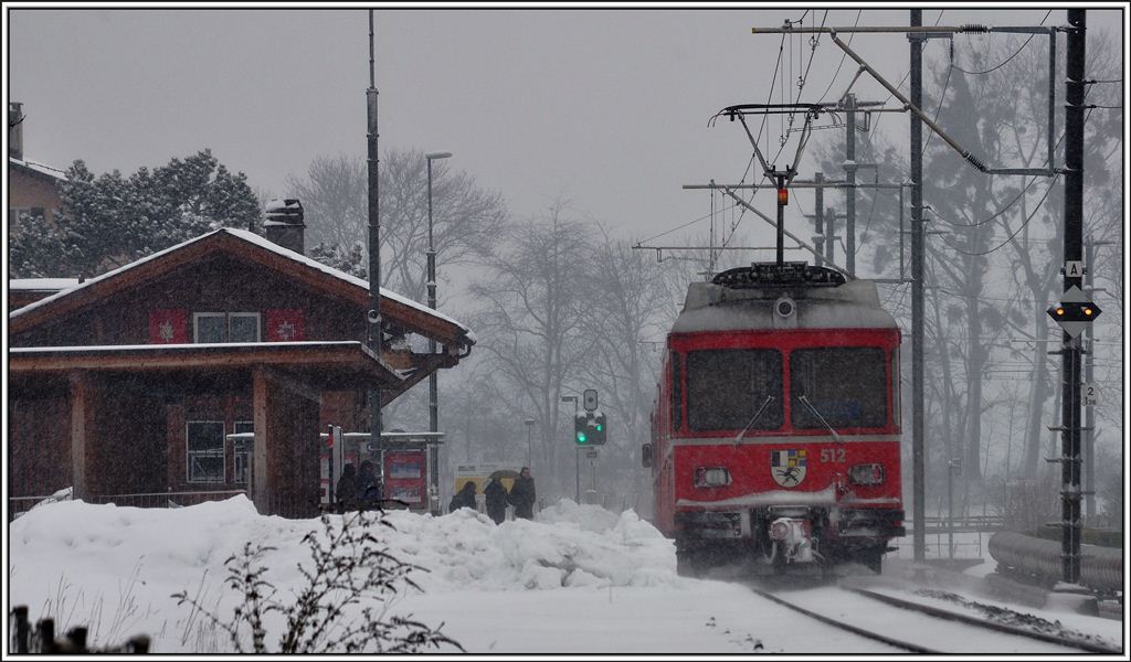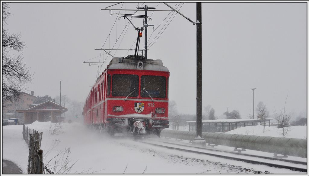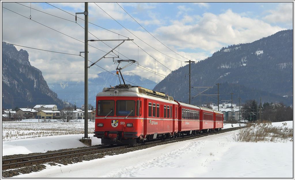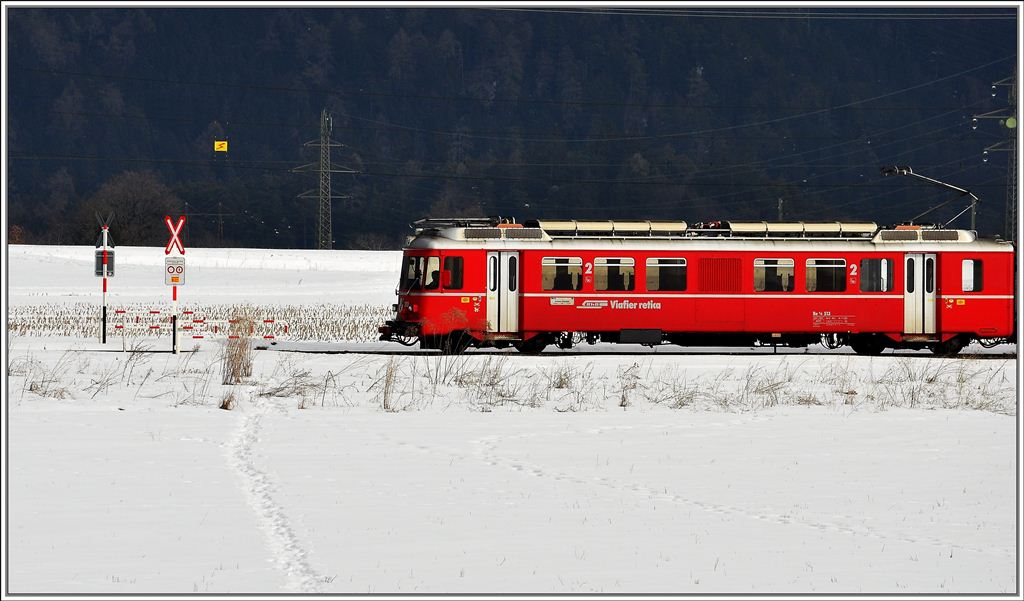 Be 4/4 513 beim Übergang Sogn Mang bei Bonaduz. Gemäss Anschrift wäre hier das Überschreiten der Geleise verboten. Nachdem aber schon seit hundert Jahren hier ein Weg vorbei führt, zeigen die Spuren im Schnee, dass diese neuen Warntafeln nicht alle abschrecken. (15.02.2013)
