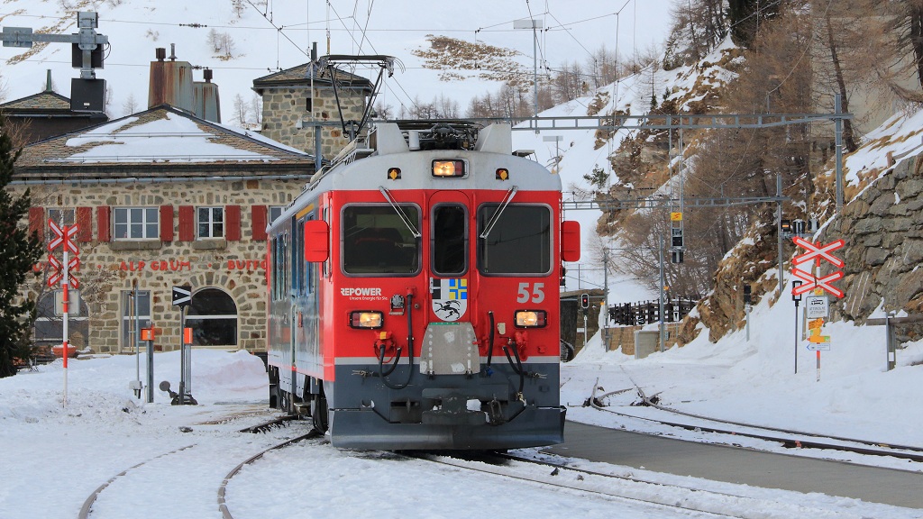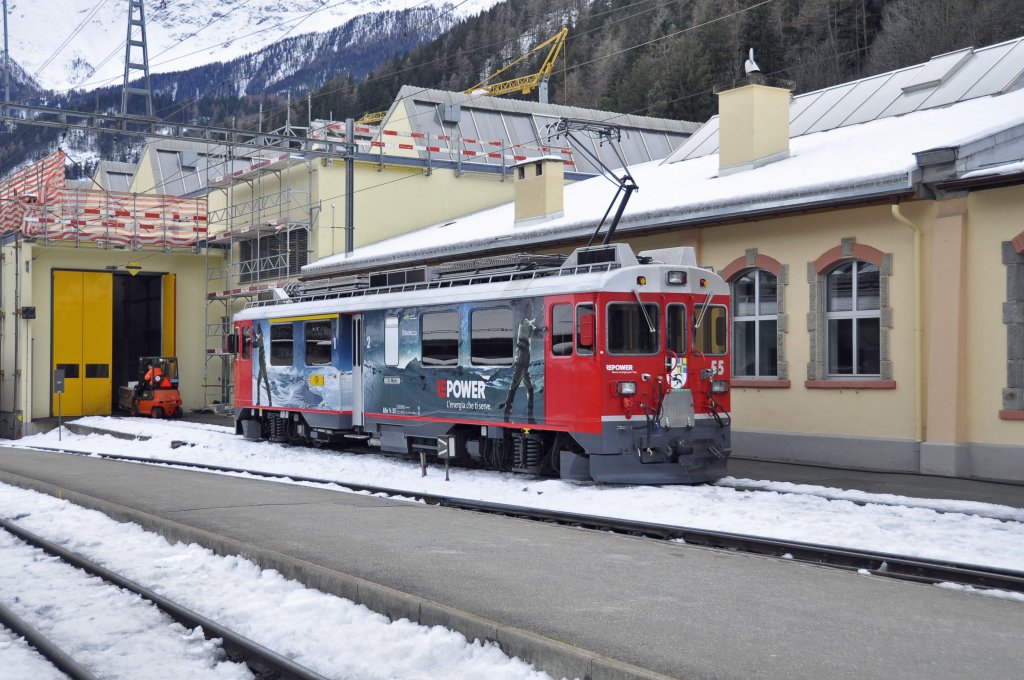 Der RhB Triebwagen 55 vom Typ ABe 4'4 III mit dem Namen Diavolezza ist am 28.1.2013 in Bahnhof Poschiavo abgestellt.