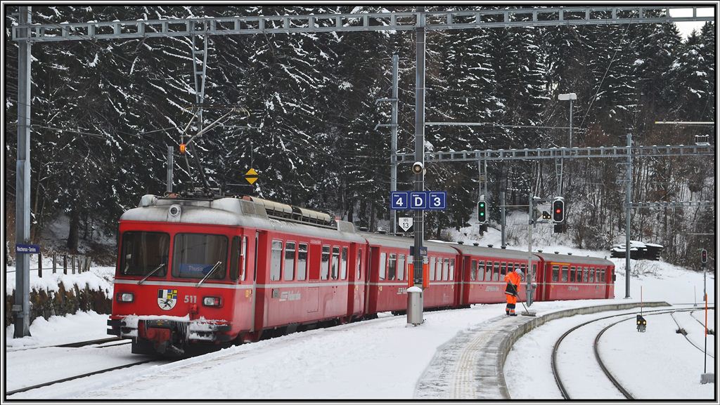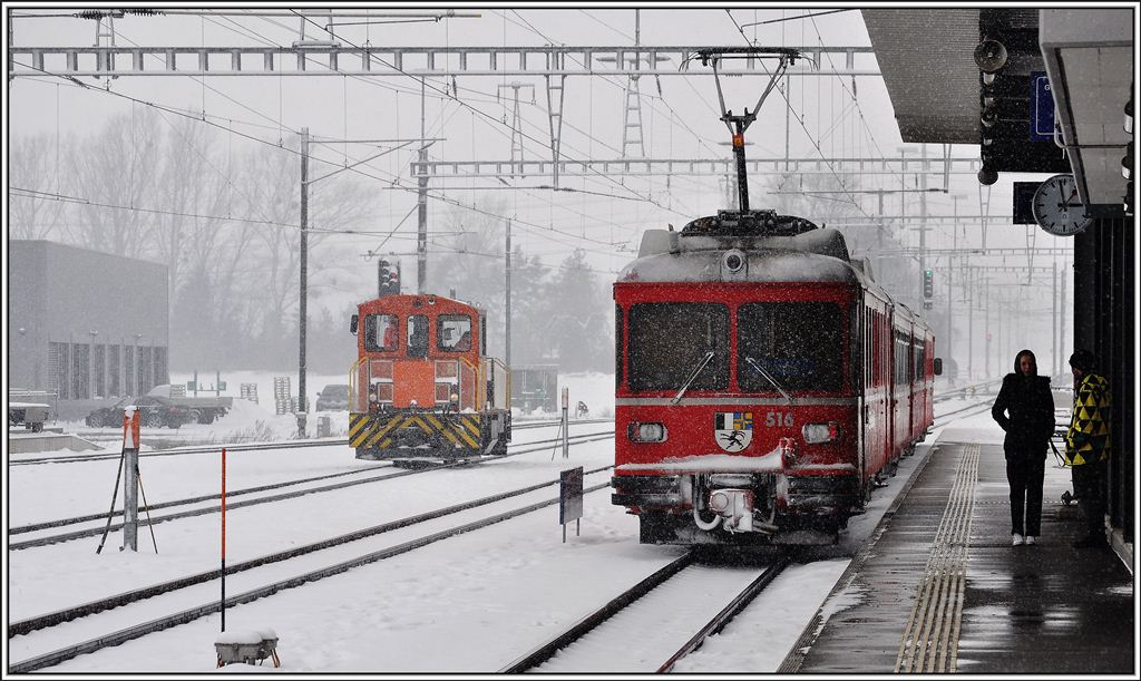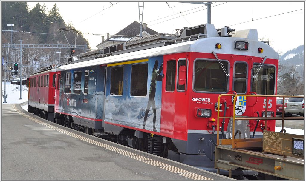 Die Ge 6/6 II 706  Disentis/Mustér  schleppt den Berninatriebwagen ABe 4/4 III 55  Diavolezza  von Landquart nach Pontresina und legt in Reichenau-Tamins einen kurzen Distanzhalt ein. (15.02.2013)