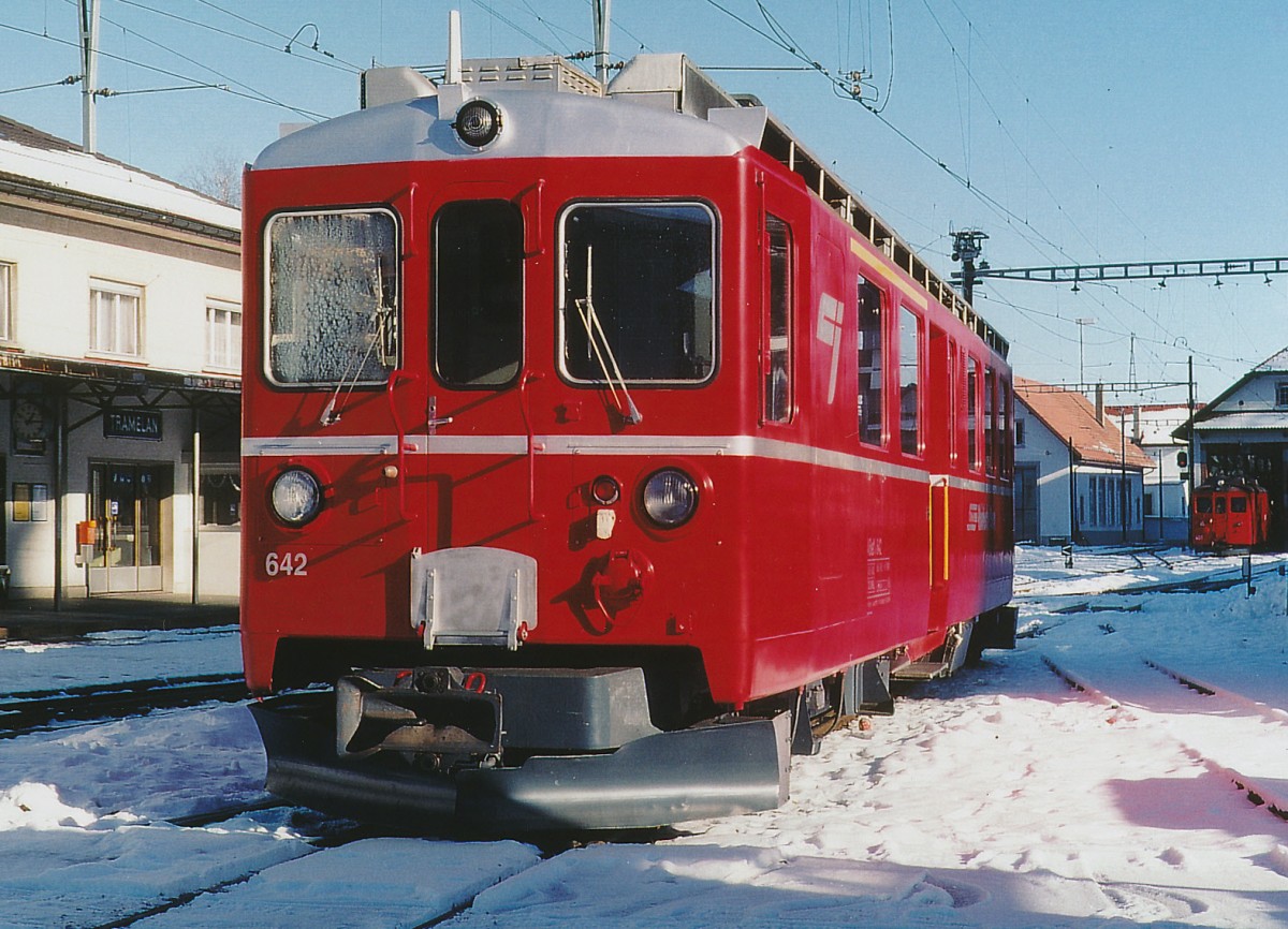 CJ/RhB: Der Gütertriebwagen ABef 642 ex RhB bei einem Zwischenhalt in Tramelan am 5. Februar 2002.