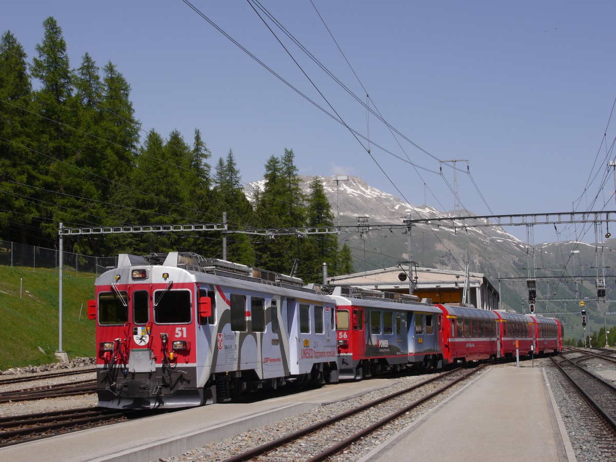 Doppeltraktion der beiden Triebwagen ABe 4/4 III 51  Poschiavo  und 56  Corviglia  vor RhB Bernina-Express BEX 973 St. Moritz - Tirano bei Einfahrt in Pontresina; 09.06.2014
