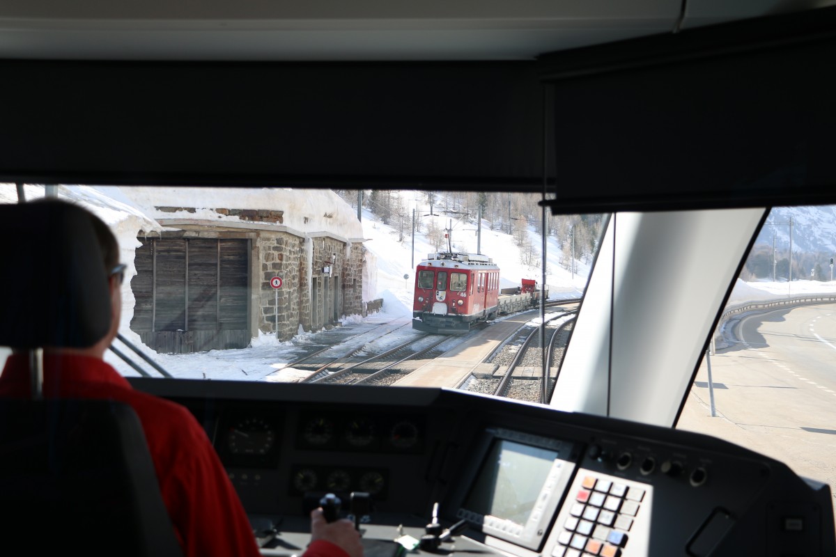 Tw 3514 mit dem R 1633 (St. Moritz-Campocologno) bei Pontresina Palü 8.3.14