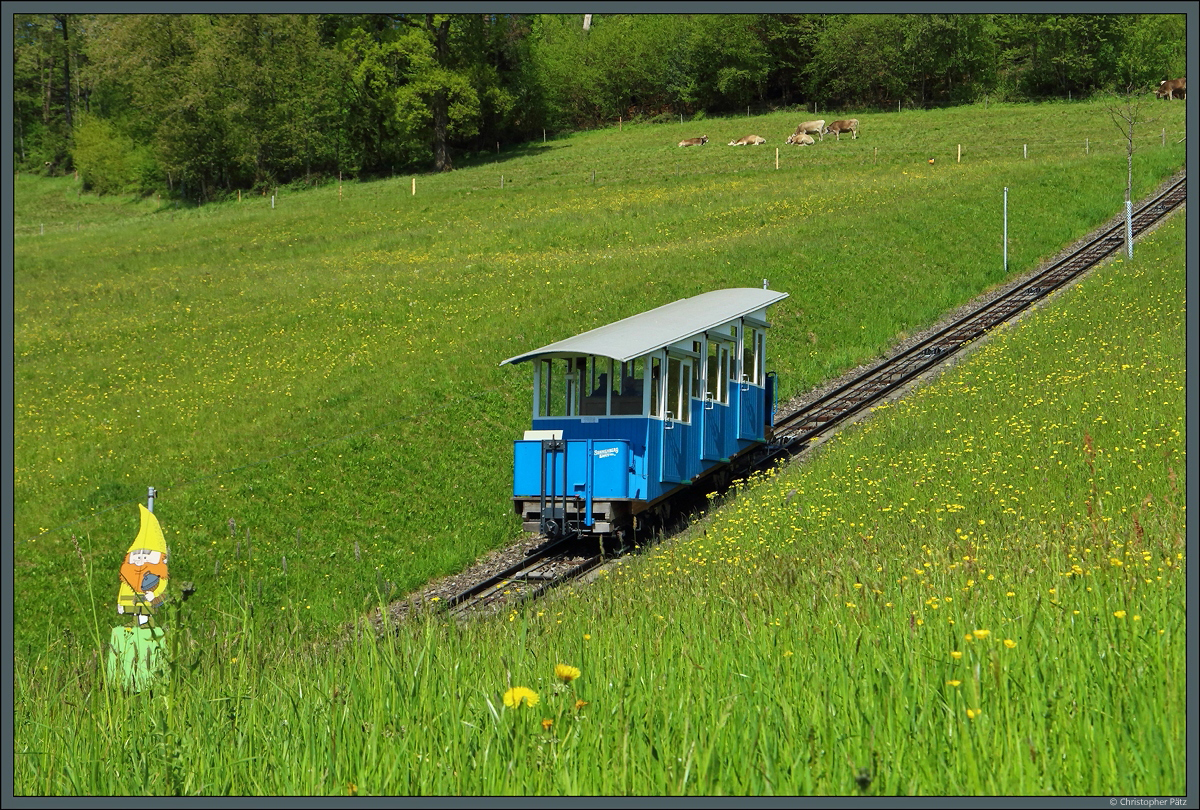 Durch saftige Wiesen, vorbei an Kühen und Gartenzwergen, nähert sich der Wagen der Sonnenbergbahn am 28.04.2022 der Bergstation. Seit 1902 ist die Standseilbahn in Betrieb, die historischen blauen Wagen stammen noch aus dem Eröffnungsjahr. Christopher Pätz