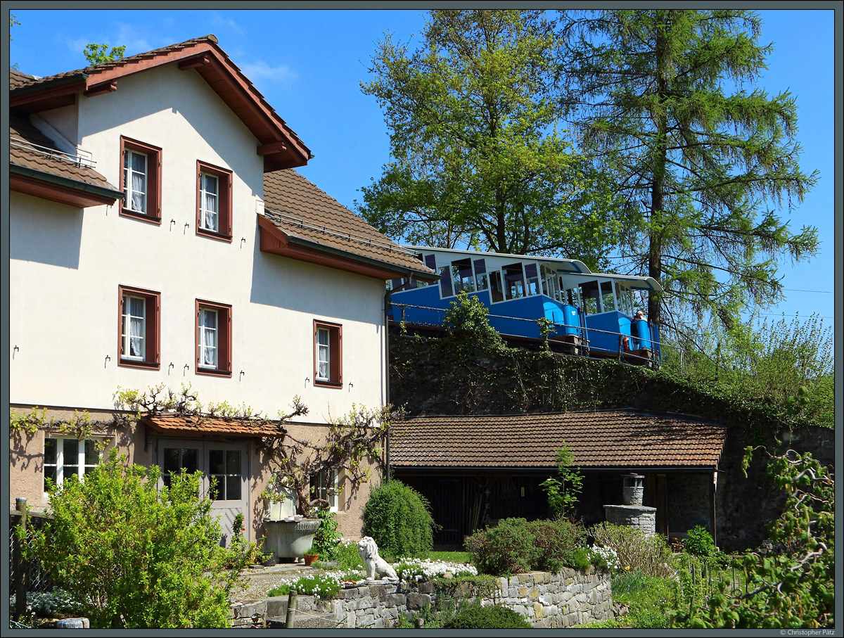 In der Mitte der Strecke, direkt neben einem gepflegten Anwesen, begegnen sich die beiden blauen Wagen der Sonnenbergbahn. (28.04.2022) Christopher Pätz