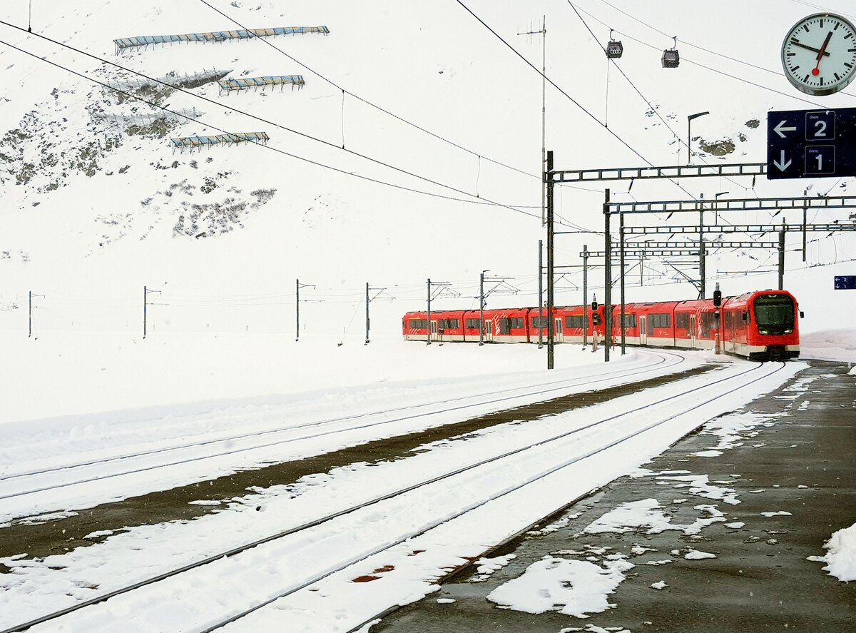 Matterhorn-Gotthard-Bahn__Zug von Andermatt fährt in die Station Oberalppass (2033m) ein. Im Hintergrund Gondeln der Schneehüenerstock-Kabinenbahn.__25-02-2024 Klaus-Erich Lisk