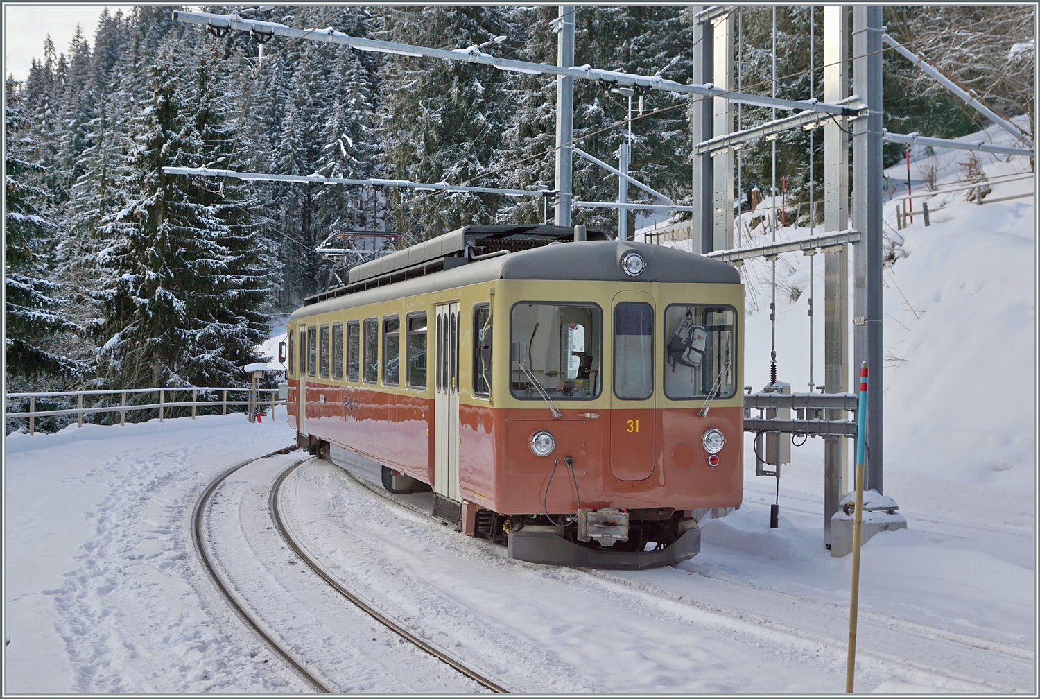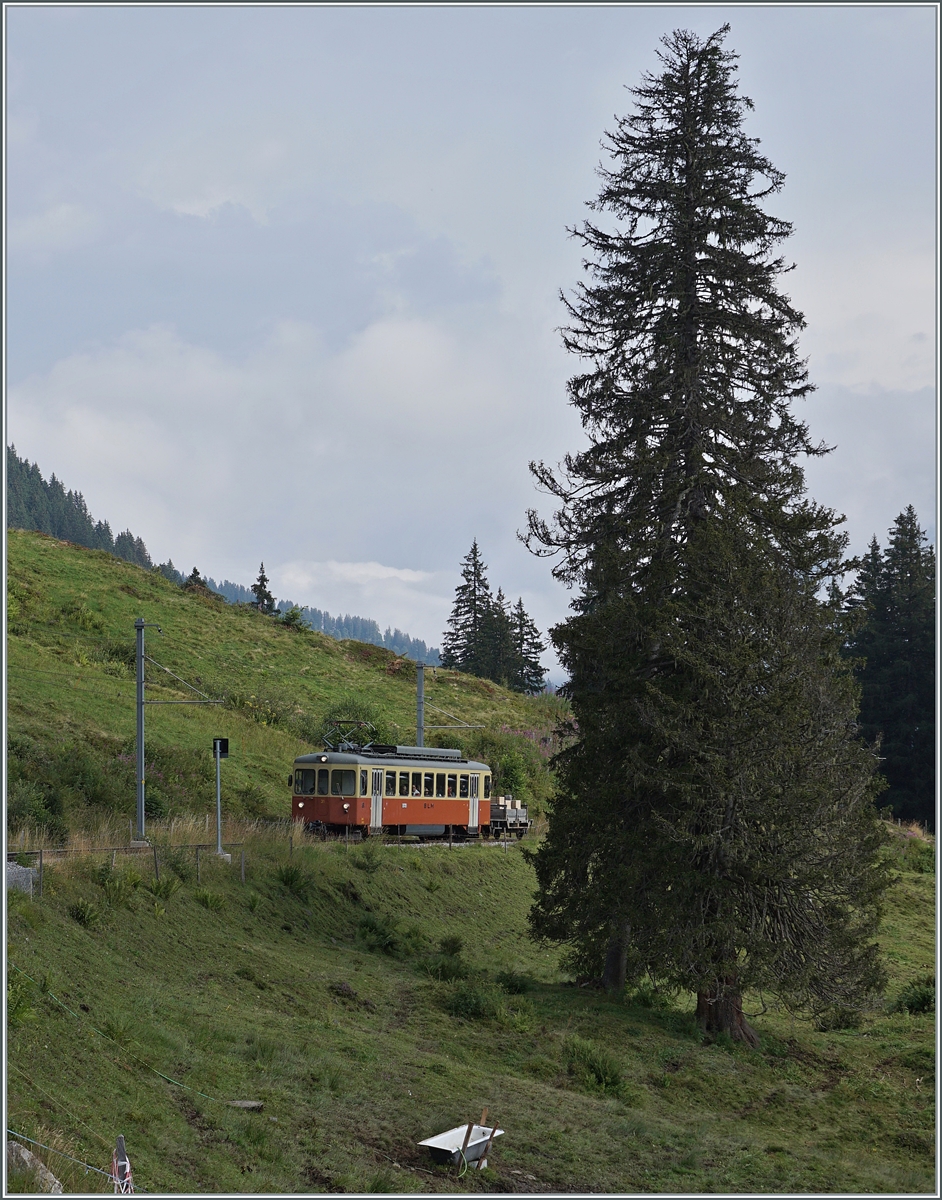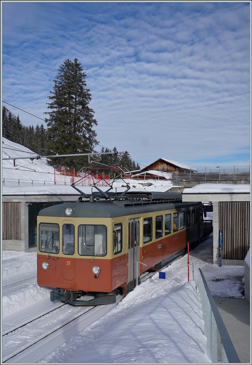 Der BLM Be 4/4 31 "LISI" wird in der Grütschalp bereitgestellt um den Halbstundentakt zum Viertelstundentakt zu verdichten.