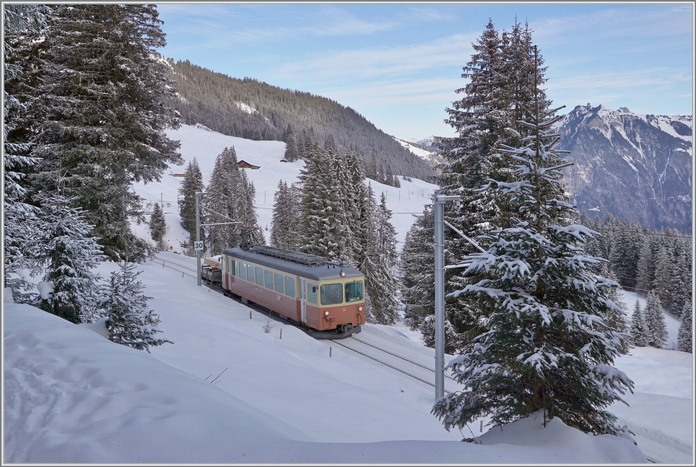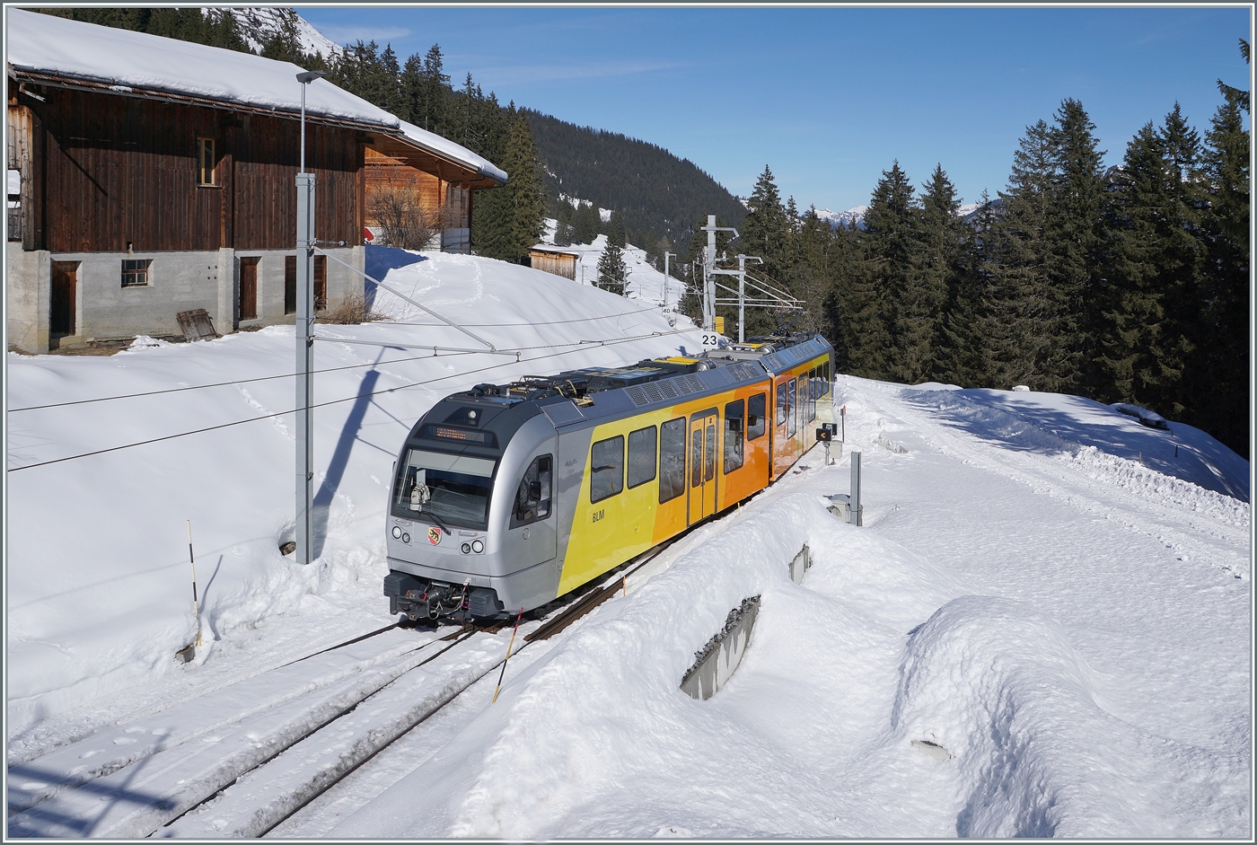 Der BLM Be 4/4 22 ist als R66 zwischen der Grütschalp und Winteregg auf dem Weg nach Mürren. Mit der Ankunft des zweiten Be 4/6 im Mai 2024 wurde der Be 4/4 22 überzählig und ins Tal gebracht.