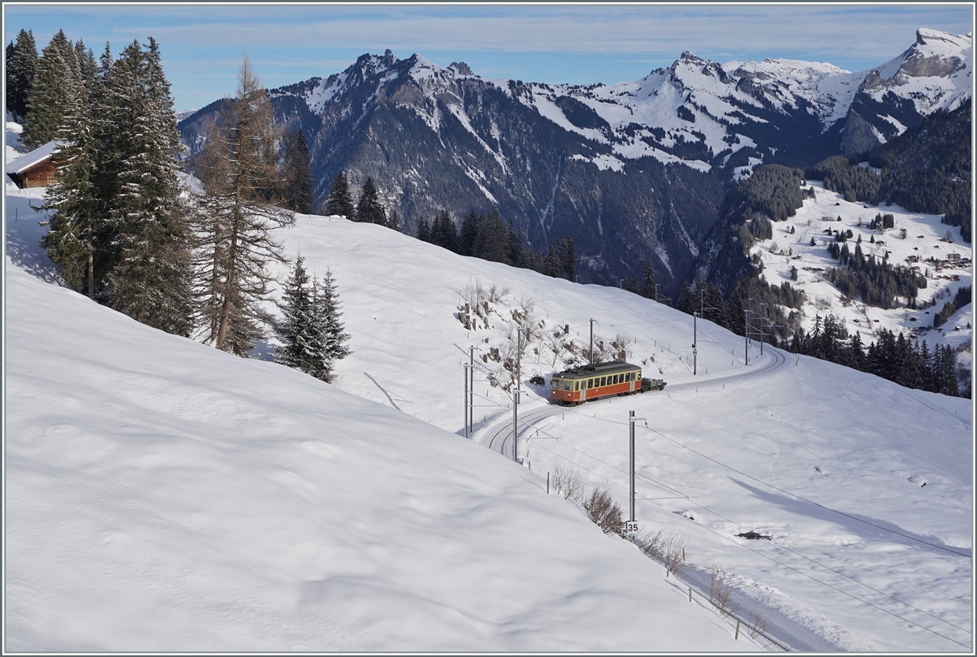 Der BLM Be 4/4 31 "Lisi" ist als R66 747 von der Grütschalp nach Mürren unterwegs und konnte bei dieser markanten Tanne auf dem halben Weg zwischen Winteregg und Grütschalp fotografiert werden.