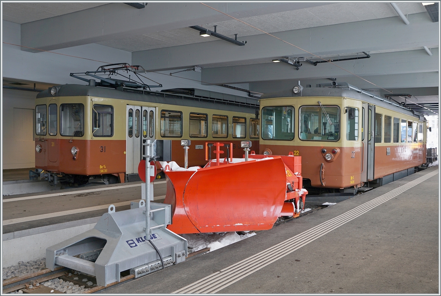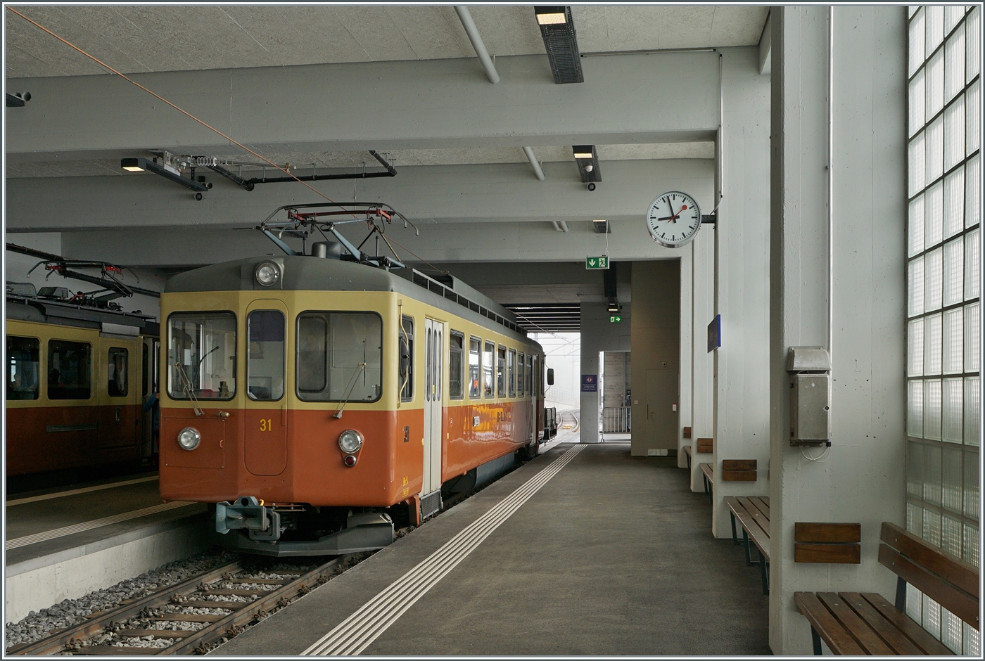 In der etwas nüchternen Bahnhofshalle von Mürren stehen die beiden BLM Be 4/4 31 (ex Bipperlisi) und der BLM Be 4/4 21. Während der Be 4/4 31 soeben aus Grütschalp in Mürren angekommen ist, wird der Be 4/4 21 Mürren in Kürze mit dem Ziel Grütschalp verlassen.