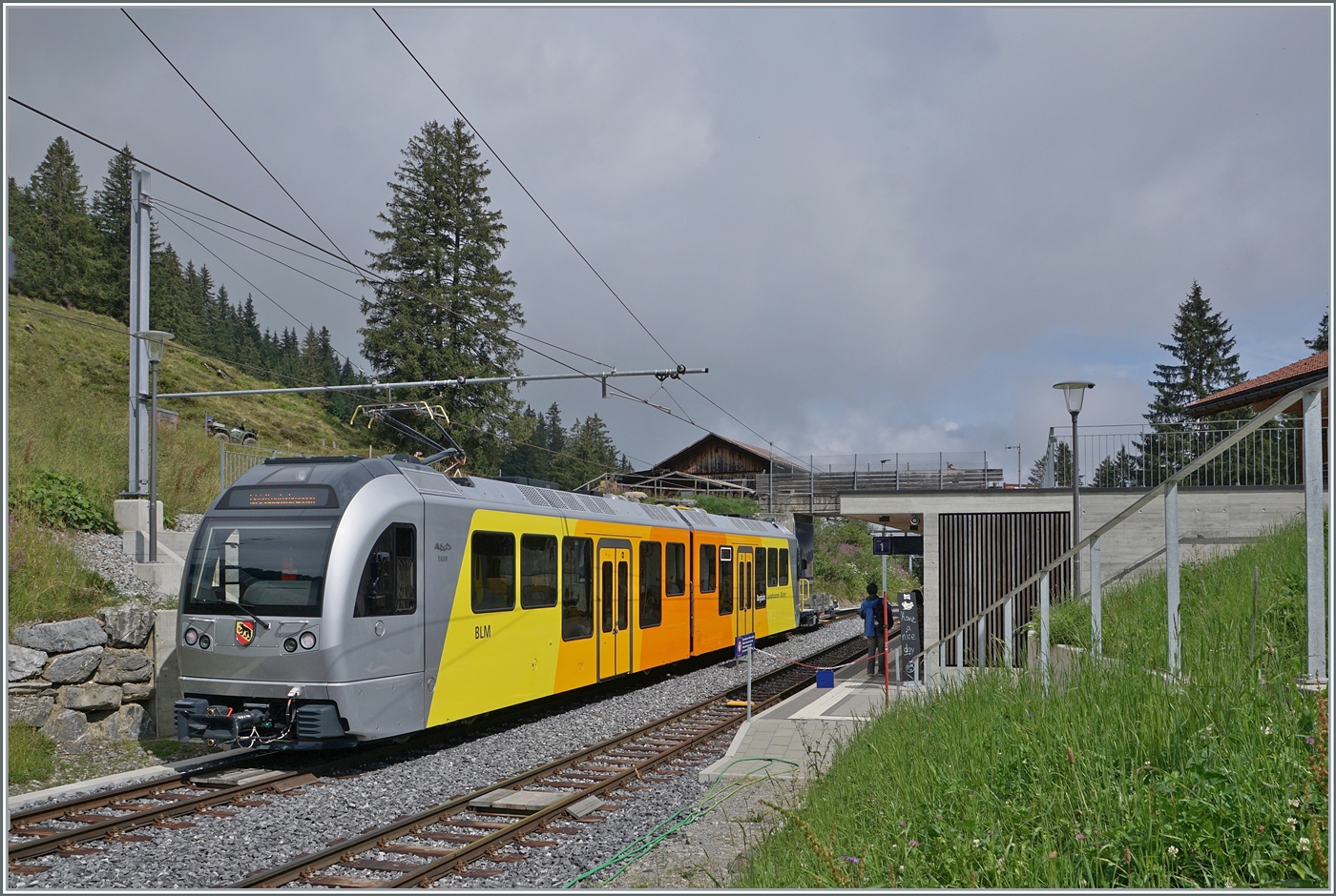 Das Bild hat einen gewissen Seltenheitswert, das die BLM Triebzüge Seite Grütschalp immer mit einem Vorstellwagen verkehren und somit die hier zu sehende Front etwas verdeckt wird. Den Vorstellwagen wird das "ex Bipperlisi" dann bei der Bereitstellung im Bahnhof übernehmen.