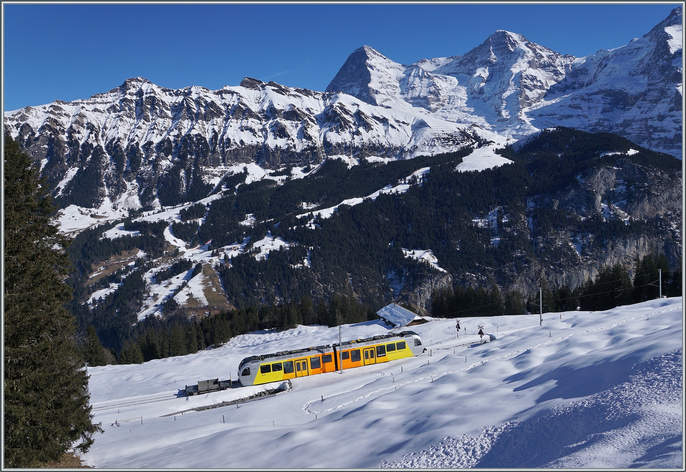 Was für ein Panorama: Eiger, Mönch und "Jungfrau"! Der BLM Be 4/6 103 "Jungfrau" ist als R66 auf der Fahrt von Mürren nach Grütschalp.