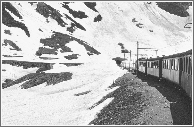 1982 wurcde der Furka-Basistunnel eröffnet. Bis dahin war das Netz der Furka Oberalp Bahn im Winter zweigeteilt. Über den Pass fuhren die Züge nur im Sommer, und noch im Juni säumte Lawinenschnee die Strecke unterhalb des Kehrtunnels bei Gletsch. (Archiv 06/77) Herbert Graf