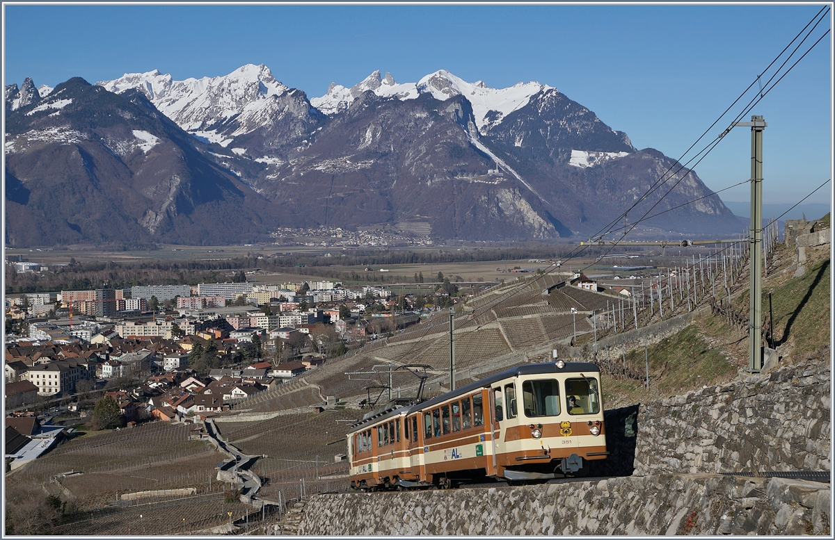 Schon wenige hundert Meter nach dem Verlassen des Bahnhofs Aigle Dépôt A-L erreichen die Züge in den Weinbergen oberhalb von Aigle beträchtliche Höhe. Das Bild zeigt hingegen eine talwärts fahrenden Zug, links im Bild ist die erwähnte Station Aigle Dépôt A-L zu sehen.