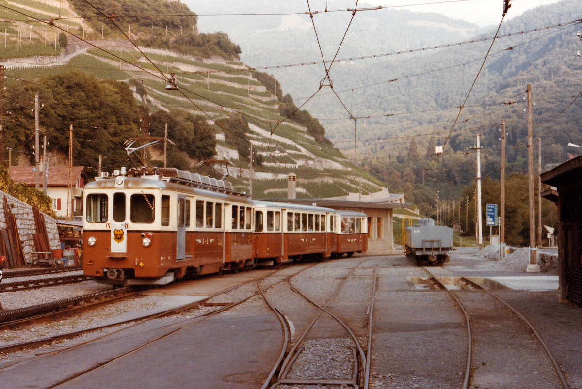 Chemin de fer Aigle–Leysin (AL)__BDeh 4/4 Nr. 302 beim Depot in den Weinbergen. Ab hier wurde im Bw-Verkehr bergauf geschoben, denn hier beginnt die Zahnstange. Von Aigle her führt die Strecke als Spitzkehre ins Depot, bis hierher normaler Adhäsionsbetrieb, bei der Ausfahrt nach Leysin steht dann der Bw in Fahrtrichtung vorne. Mit den Wendezügen wäre das heute nicht mehr erforderlich.__06-09-1976 Klaus-Erich Lisk