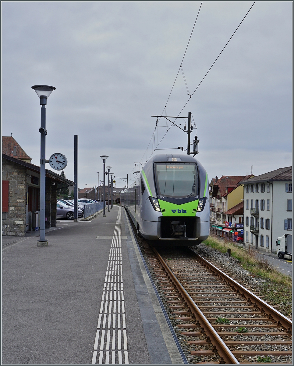 20 % mehr Reisende - Region Alpes kommt an ihre Grenzen und hat deshalb bei der BLS einen RABe 528 MIKA gemietet, der von Montag bis Freitag zwei bis drei Umläufe abdeckt. So können die dafür frei werdenden Domino-Züge zur Verstärkung anderer Züge genutzt werden Das Bild zeigt den BLS RABe 528 109 in St-Gingolph der als R 91 6125 auf die Abfahrt nach Brig wartet.