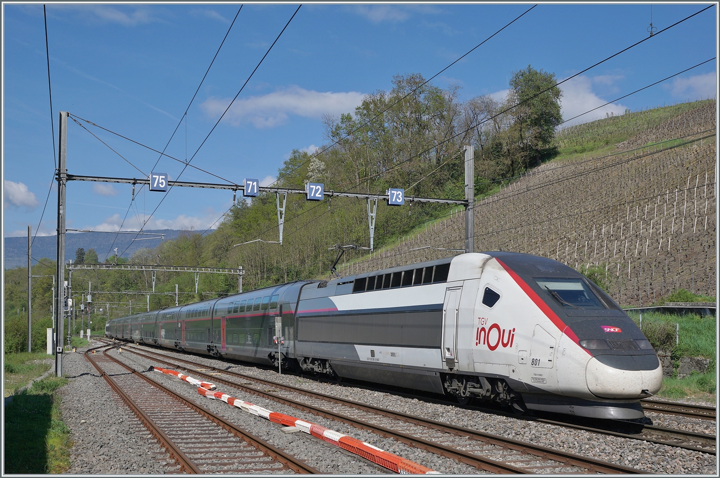 Infolge div. Bauarbeiten hat Lyria die TGV Verbindungen Paris - Lausanne via Genève im Fahrplanjahr 2026 auf Paris - Genève verkürzt. Dies hat den Vorteil, dass auch nicht Schweiz taugliche TGV Züge eingesetzt werden können. Das Bild zeigt den SNCF inOui TGV Rame 801 als TGV LYRIA 9768 von Genève nach Paris Gare de Lyon bei der Durchfahrt in La Plaine.