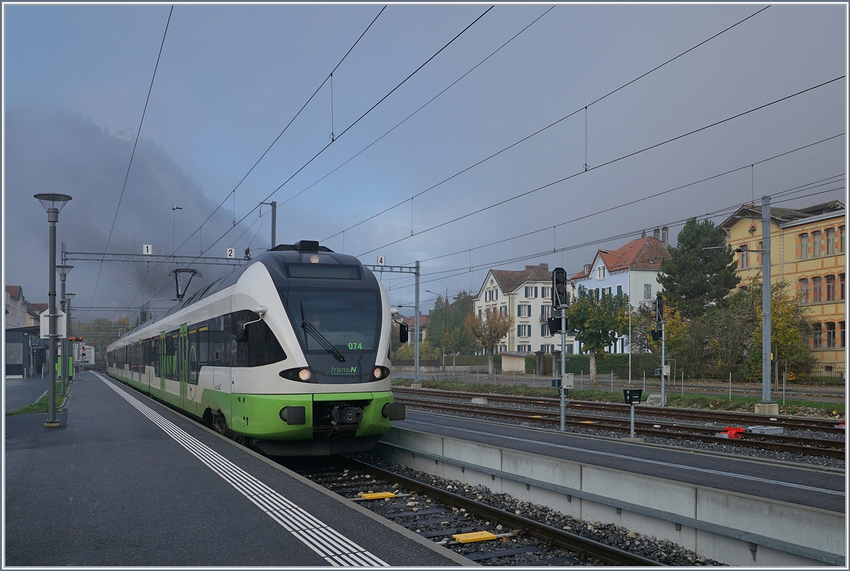 Im stimmungsvollen Morgennebel wartet der von der transN gemietet SBB RABe 523 074 in Noiraigue auf die baldige Weiterfahrt nach Buttes.