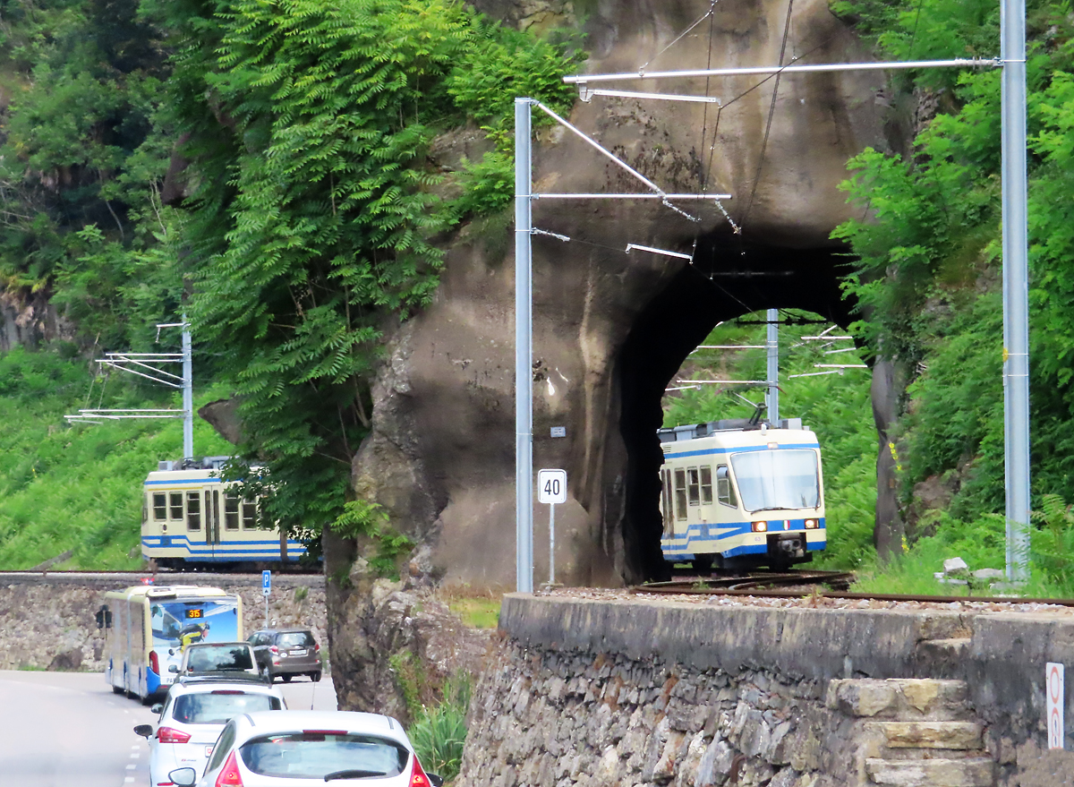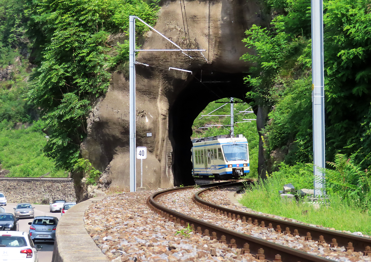 Viel Verkehr auf der Hauptstrasse, währenddem der Regionalzug von Camedo nach Locarno in wenigen Sekunden den kurzen Tunnel zwischen Ponte Brolla und Solduno S. Martino durchfährt. Locarno, 29.7.2023