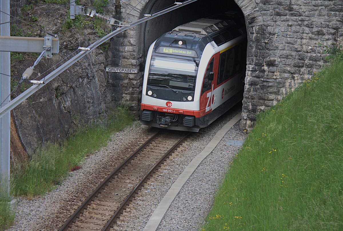 Zentralbahn-Zug, geführt vom dreiteiligen Triebzug 160 004, schlängelt sich von Brünig-Hasliberg nach Käppeli herunter, unterwegs nach Luzern. 6.September 2022 Peter Ackermann