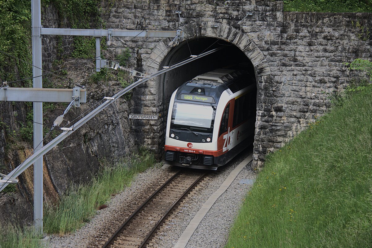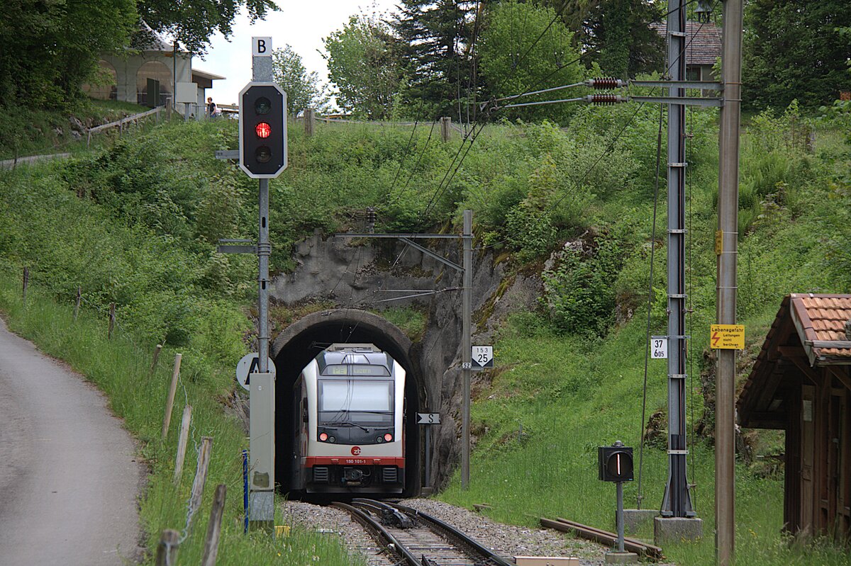 Zug der Zentralbahn Luzern - Interlaken. Zusammensetzung: 160 002 + Speisewagen 150 303 + die Hälfte des "Adler"-Zugs 150 203 + 161 011. Warten auf einen Gegenzug in der Kreuzungsstation Käppeli. 6.September 2022 Peter Ackermann