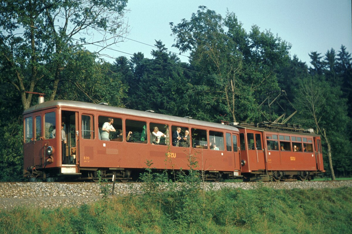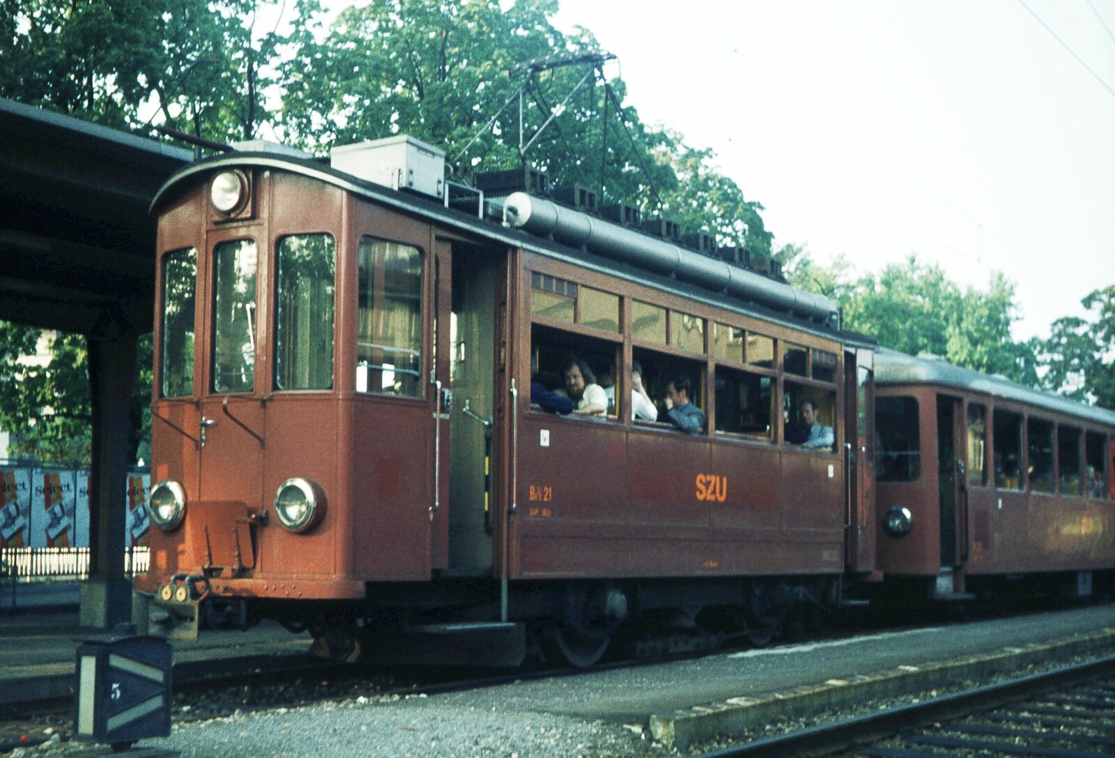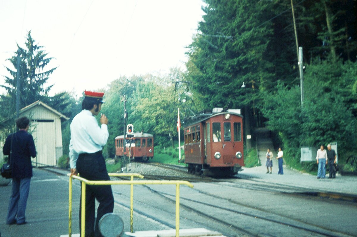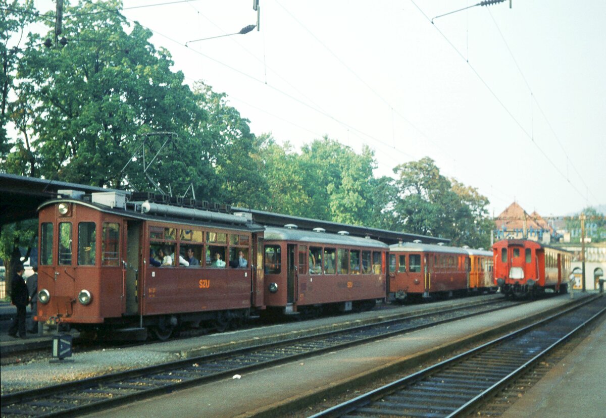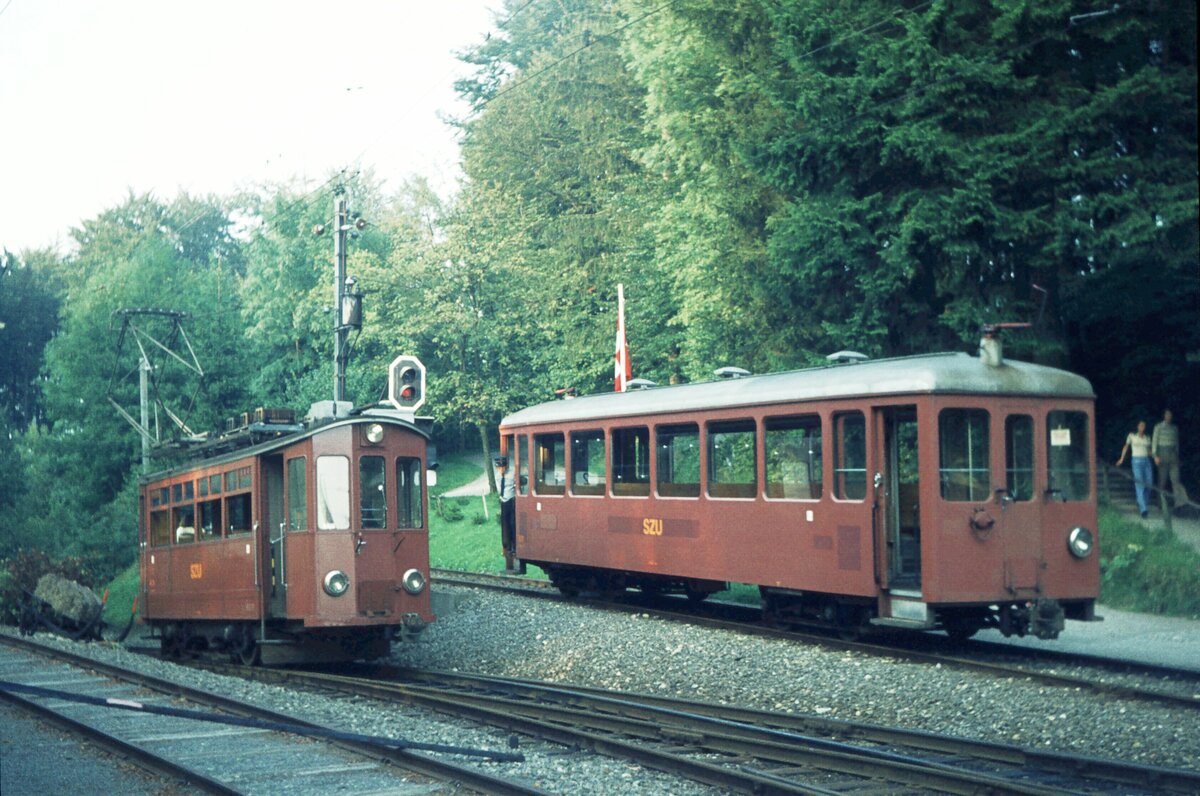 Uetlibergbahn Zürich__anläßlich einer Sonderfahrt am 14-09-1974. Uetliberg-Tram Ce 2/2 Nr.2 aus dem Jahr der Elektrifizierung 1923 rangiert. Ein Jahr später mit dem Zusammenschluß der Bahngesellschaft Zürich–Uetliberg (BZUe) mit der Sihltaltalbahn zur Sihltal-Zürich-Uetliberg-Bahn (SZU) wurde aus Tw 2 Tw 22. Tw 2 (22) stand laut wikipedia bis 2014, restauriert in der ursprünglichen grünen Farbgebung, im Verkehrshaus der Schweiz (VHS) und seit 2015 in Winterthur als stationäres Restaurant. Bw 213 (ex Nr.63; Bj. 1950) auf dem Nebengleis wurde 1994 ausrangiert. Klaus-Erich Lisk
